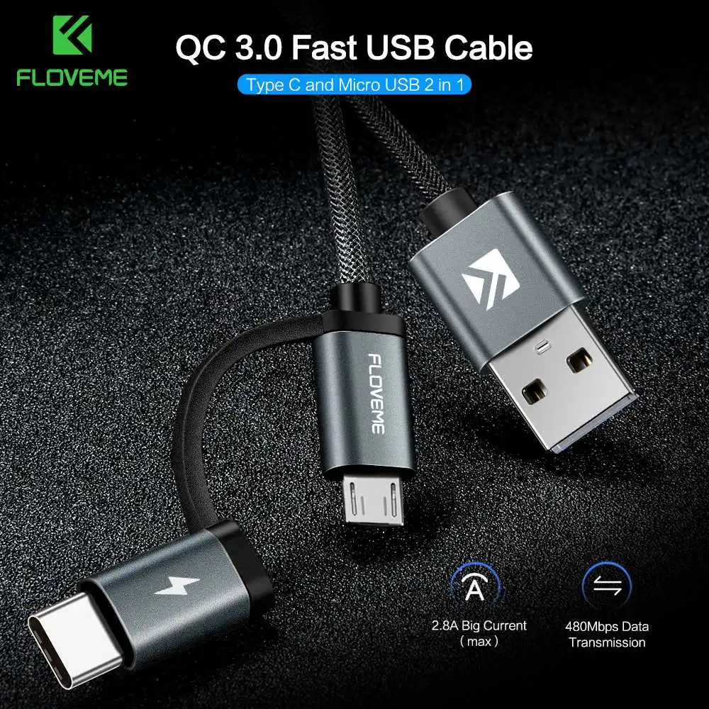 Кабель FLOVEME 2 в 1, Micro USB Type-C, QC 3,0, быстрая зарядка, Ty...