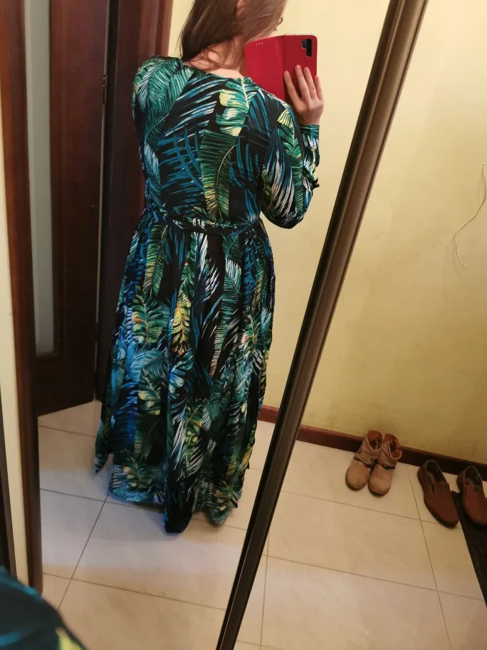 Платье дошло очень быстро, менее 3х недель до Германии. Ткань - вискоза, а не полиэстер. На ощупь приятная. Юбка, к сожалению, не такая широкая, как на фото. Длина почти хорошо на мой рост 180, ещё бы 5 см и идеально. Оно не в пол, по щиколотку. В остальном размер М на параметры 92-62-94