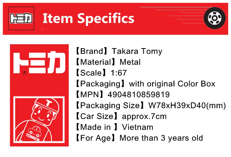Номер товара. : 4904810859819Производитель: TAKARATOMYБренд: TomicaРазмер посылка: W78 x H41 x D39 ммЦелевой возраст: 3 года ~