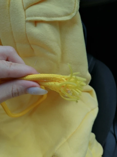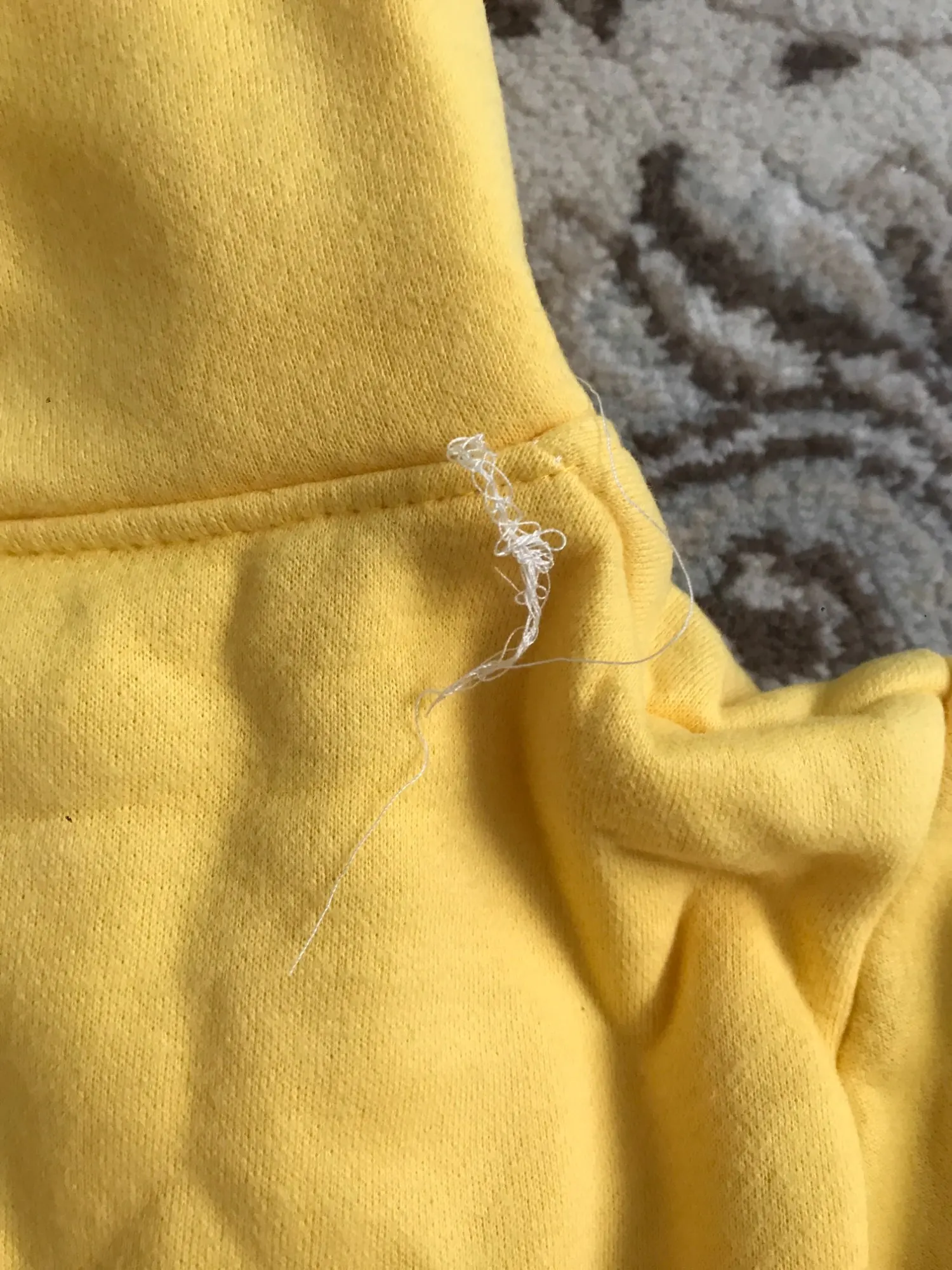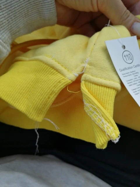 Заказ пришёл за 1,5 месяца. Заказала уже 2-ю толстовку, сшита так же косячно как и первая)) вся перекособоченная и кривая, ещё в этот раз продавец не положил шнурок для капюшона, зато положил резинку в подарок. Есть нитка прям на шве, и был сильный запах. Цвет красивый, сочно-жёлтый) Плюс этой кофты, что она достаточно тёплая, объемная и дешёвая, убивать её во дворе или на даче не жалко) Для этих целей к покупке рекомендую!