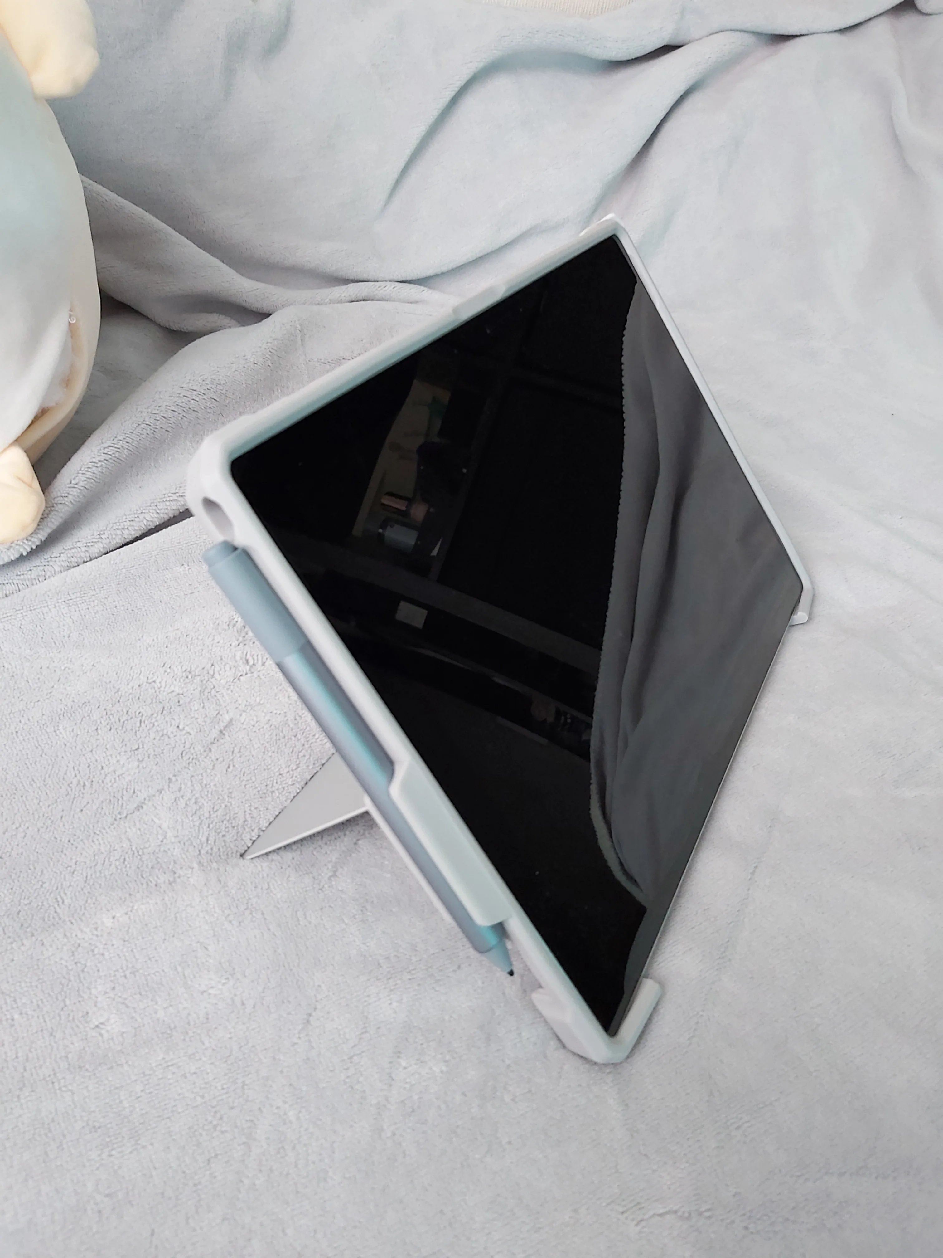 pen is on the same place as the stand. with pen you can't open the stand. very annoying as that's what I do several times a day. per meeting. other side was fine.