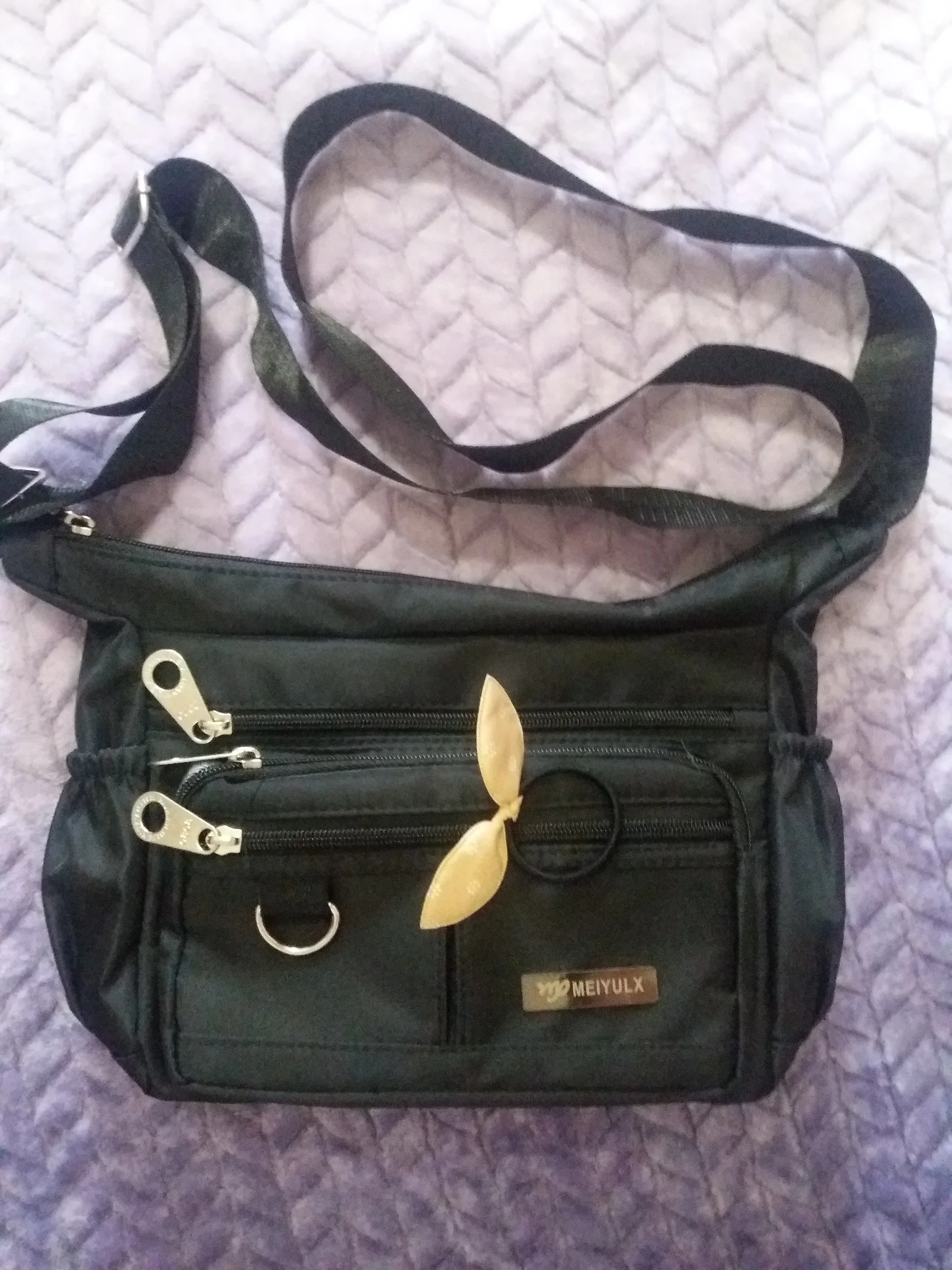 Сумка мне очень понравилась. Небольшая, но очень вместительная. В неё поместились мои кошелёк и контейнер с едой (0,5 л), множество мелочей и телефон. Снаружи много карманов. Внутри один большой отсек и карман на молнии. Также снаружи есть небольшое крепление, на которое можно повесить брелок. В подарок продавец положил симпатичную резинку для волос, за что спасибо. Все швы довольно крепкие и ровные, но в месте металлического крепления на ремешке торчат нитки и шов немного неровный (на фото). Все молнии работают хорошо и гладко. Посылка пришла быстро, заказала 11.11, пришло 03.12. Доставили до ближайшей Пятёрочки (для этого нужно было пройти специальную регистрацию). Сумкой довольна, советую.