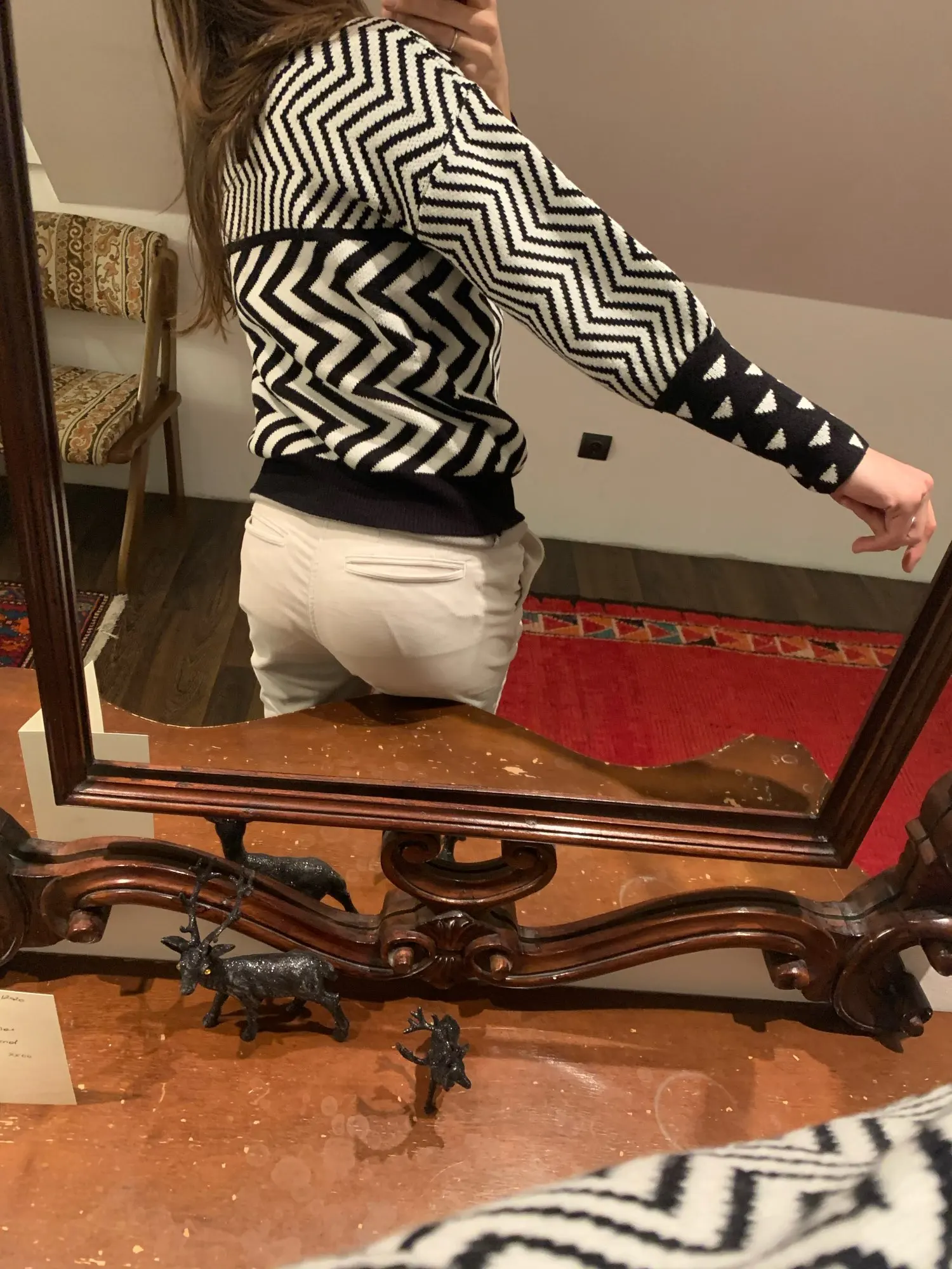 интересный свитер. он не короткий, хотя только в одном размере. Довольно толстый.
