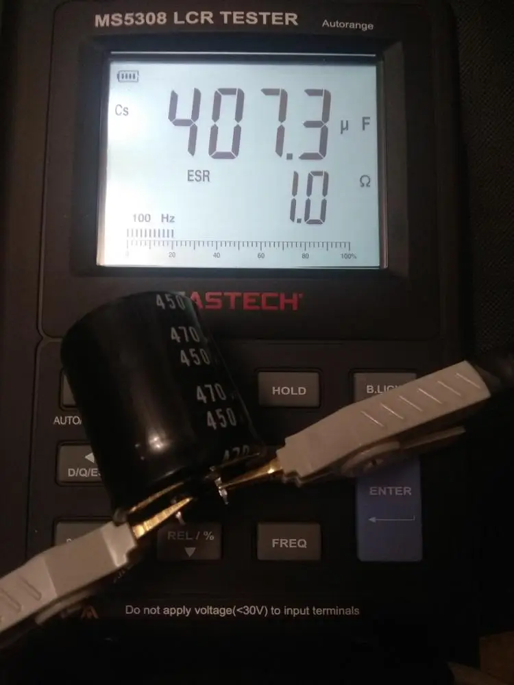 ESR и утечка в отличном состоянии, ёмкость не 470, а 420 мкФ, но всё равно не 330, как в большинстве других магазинов.