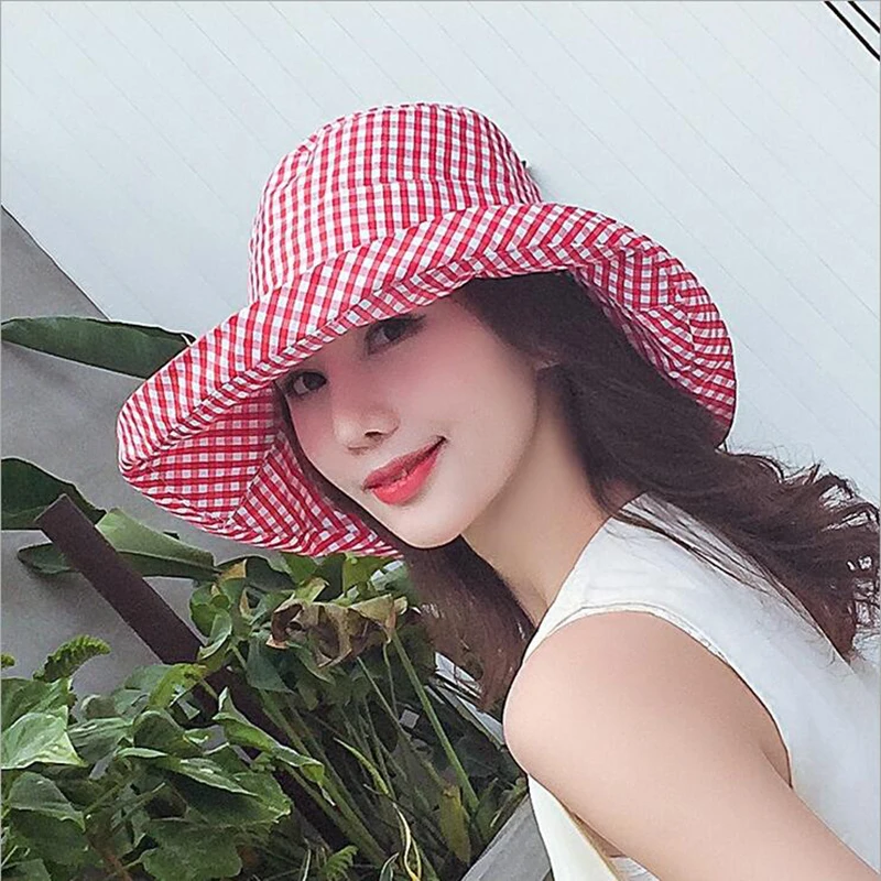 2018 Летняя женская клетчатая шляпа от солнца женская летняя большая шляпа с широкими полями хлопок анти-УФ пляж широкополая шляпа от солнца шляпы, кепки с плоским верхом Боб вводная, мужские и женские бейсбольные кепки