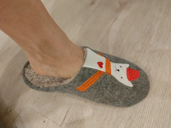 Хорошие мягкие тапочки, вышивка очень качественная и яркая, подошва мягкая и амортизирует при ходьбе. На носок надо немножко разносить, если брали на свой точный размер ноги. На босую ногу садятся отлично по размеру, а вот с Толстых носком новые тапочки ещё слишком плотные, и нога не до конца в них проходит, но со временем, думаю, все примнётся и разносится. Продавец отправил товар быстро.