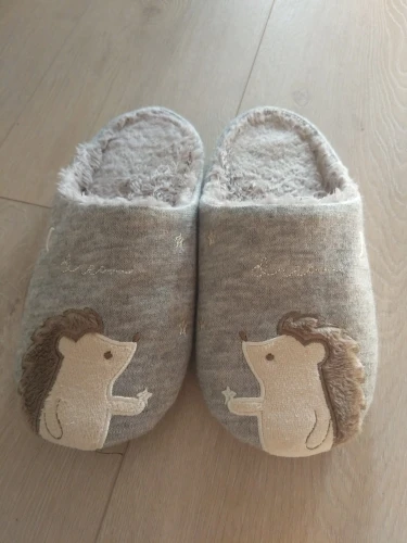 Тапочки маломерят на один размер, 43 р. идёт на стопу 26,5 см. Понравились. Коричневые с ёжиками визуально и внутри по объему меньше чем серые, хотя размер один. У серых внутри велюр, он не скользит. А у коричневых синтетический скользкий мех. Подошва из необычного материала, пошиты аккуратно. Теплые, возможно даже будет потеть нога. На подошве написано 295 мм, но там внутри на ногу 265 мм. Спасибо!