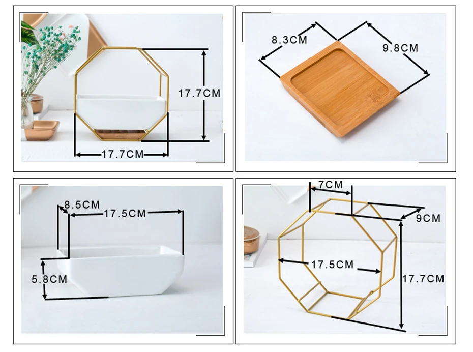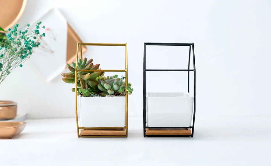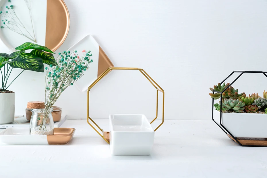Металлическая железная стойка, белый керамический горшок, простой восьмиугольный геометрический настенный висящая керамическая ваза керамический цветочный горшок, бамбуковый поднос, железный каркас