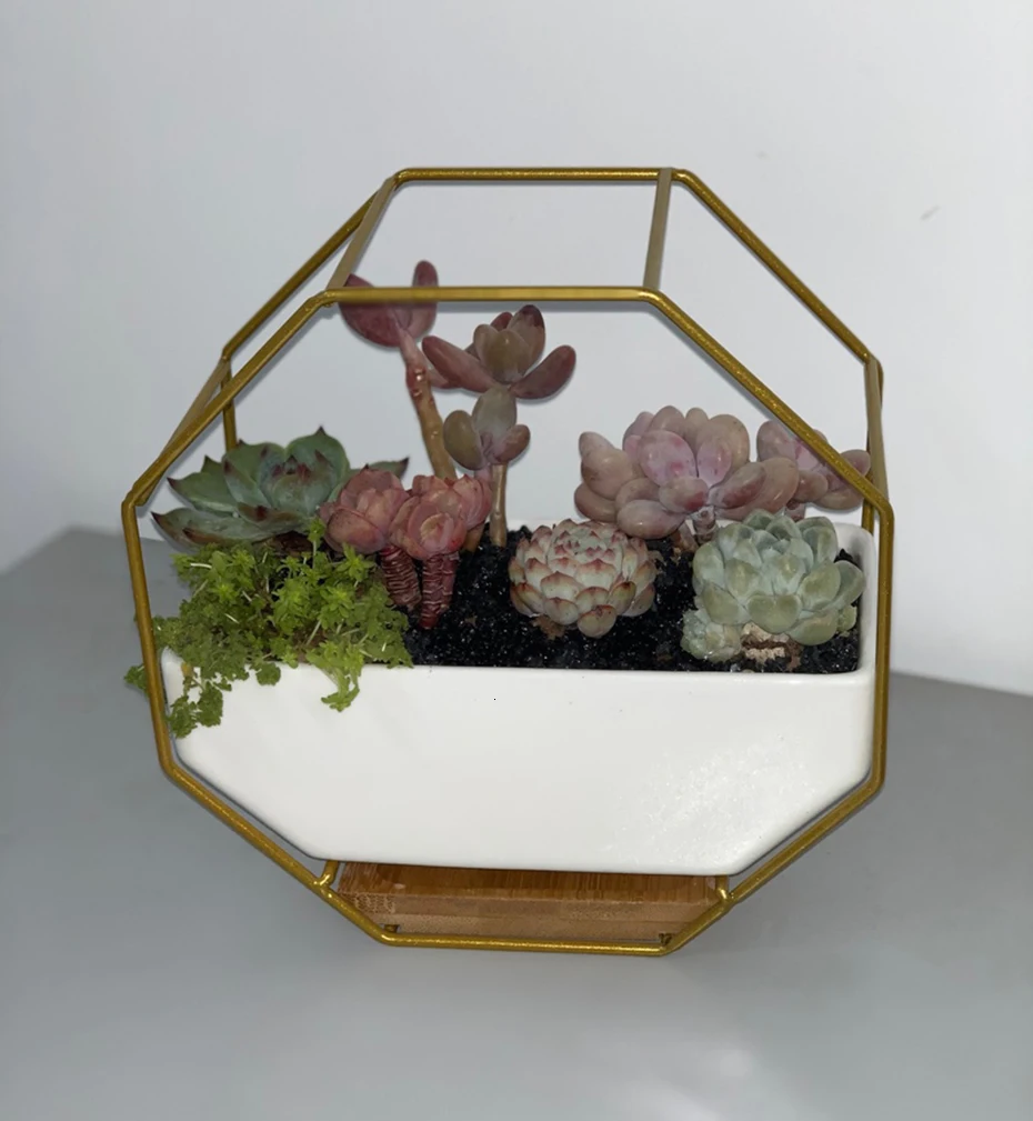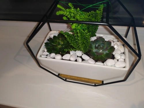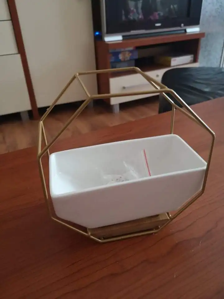 Представляла кашпо несколько больше, чем оно есть на самом деле. Металлические опоры не чисто золотистого цвета, но издалека не заметно. В самом горшке есть дренаж, так что вполне можно посадить что-то, а не просто использовать искусственные цветы