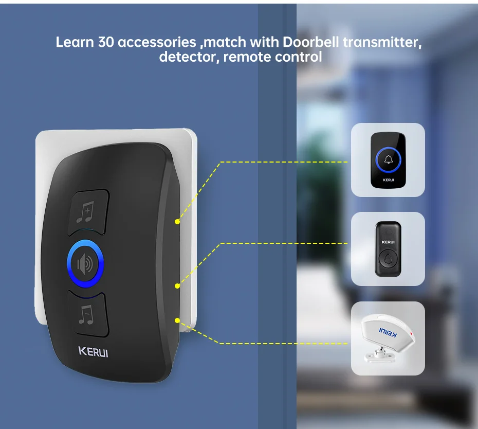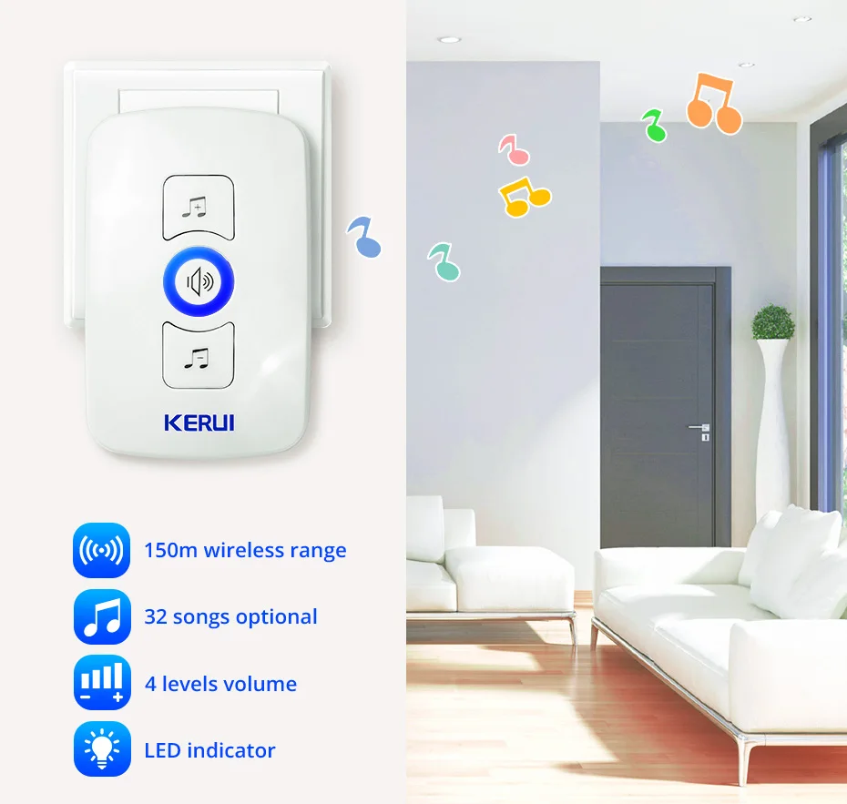 Беспроводной дверной звонок использует передовые беспроводные технологии приема и отправки, мощную систему управления микрокомпьютером, высокую емкость и превосходную технологию обработки голоса, до 32 песен с надежной и стабильной производительностью. Дверной звонок и передатчик подключаются через беспроводной обучающий код, с функцией дверного звонка, охранной сигнализации и приветственной сигнализации, которая подходит для различных случаев: как вилла, клуб, центр отдыха, магазин, отель, дом, офис, конференц-зал и т. д.