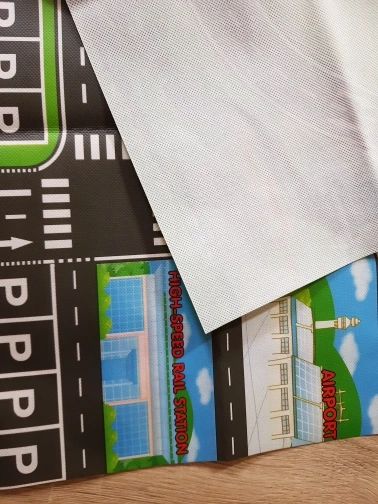 Коврик как клеенка с мягким подкладом, очень яркий. Сыну понравился