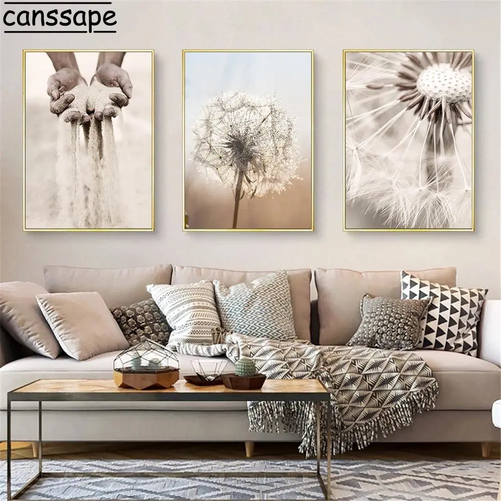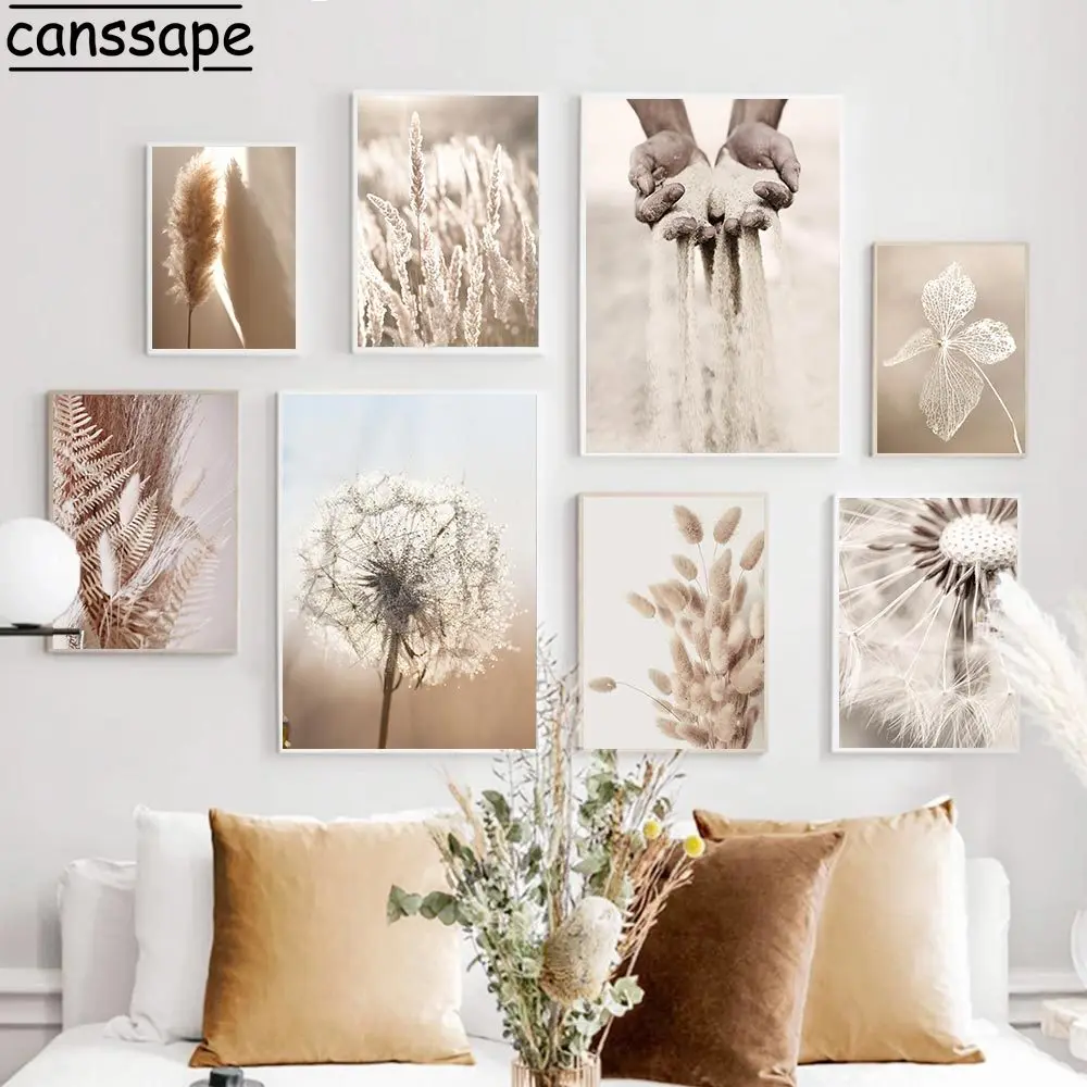 Настенный постер с сушеными цветами и травой, настенные постеры в скандинавском стиле с рисунком одуванчика, настенный постер с бежевым язычком, настенные картины, декор для гостиной