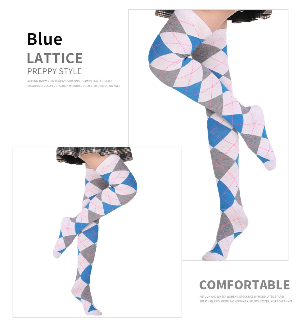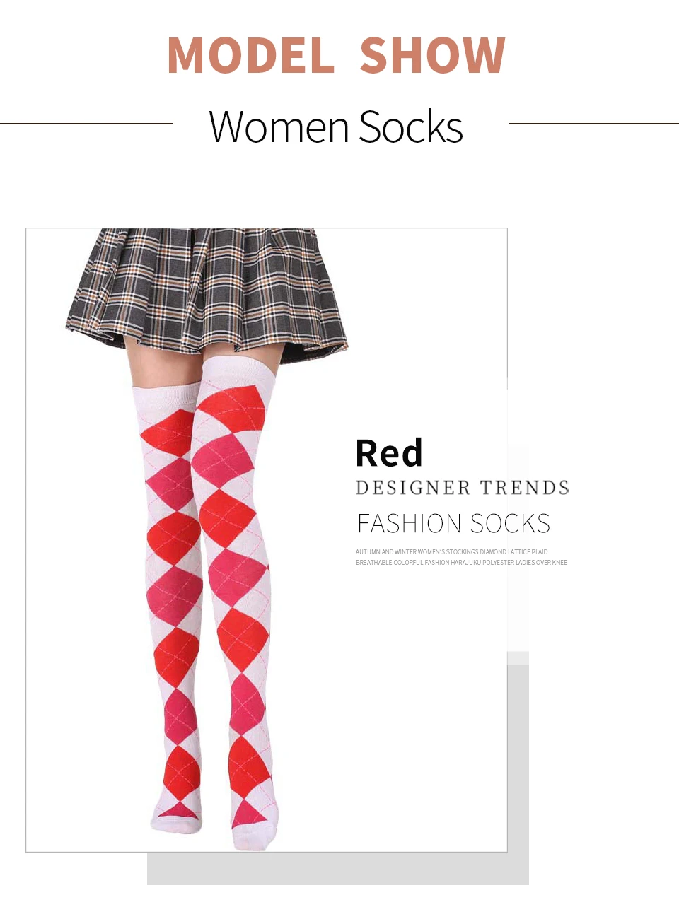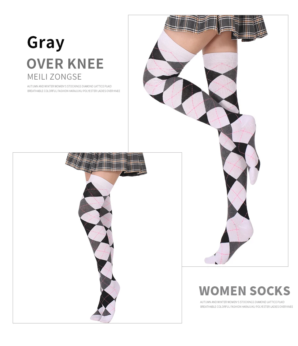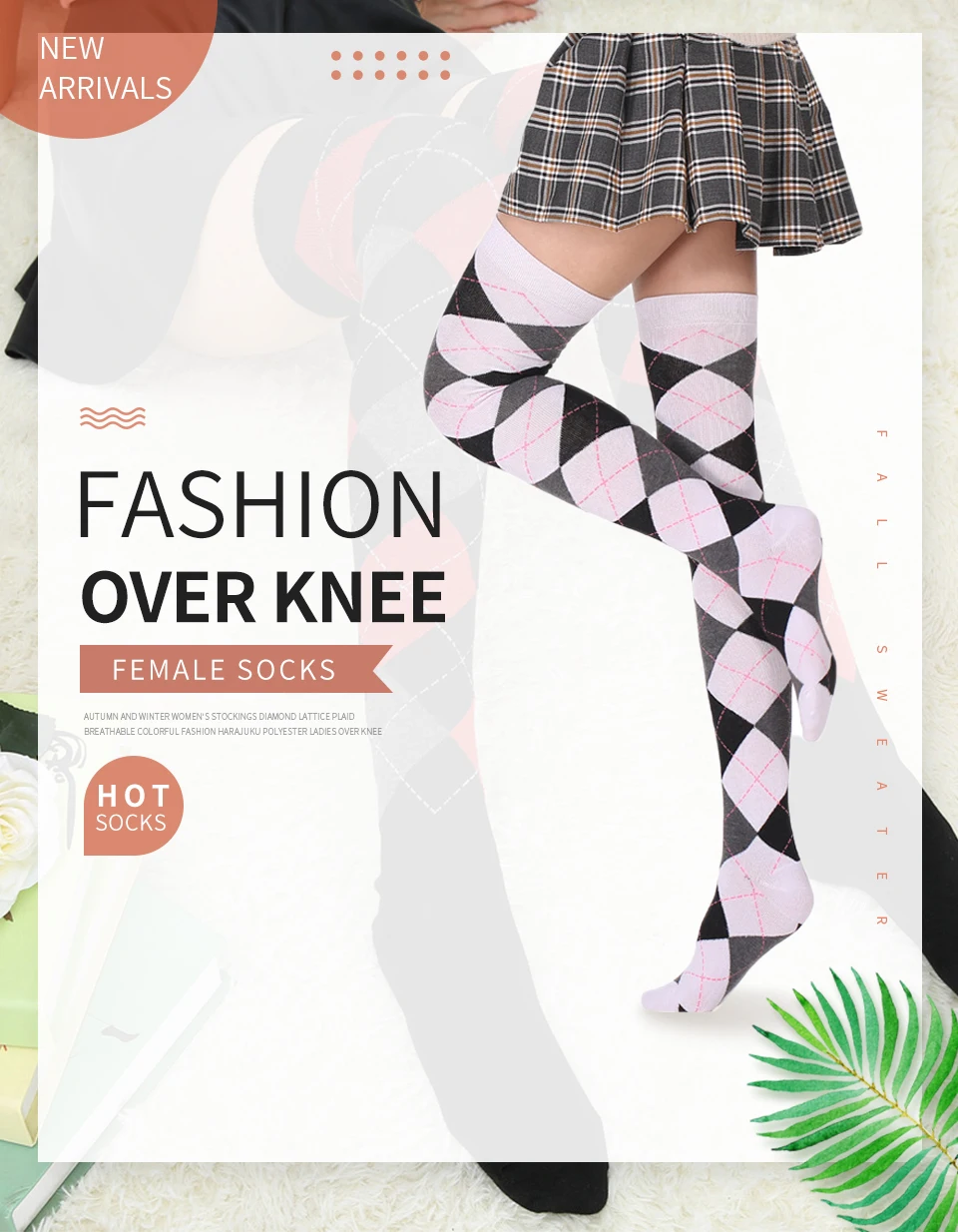 Женские осенне-зимние чулки, клетчатые дышащие красочные модные женские чулки выше колена из полиэстера в стиле Харадзюку с ромбовидной решеткой