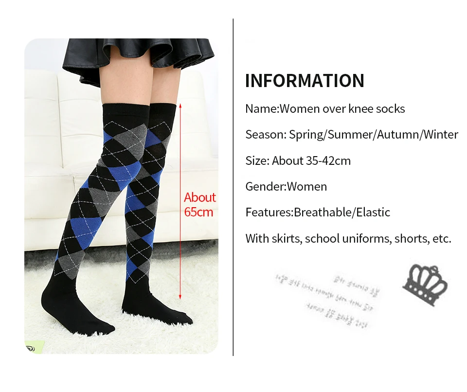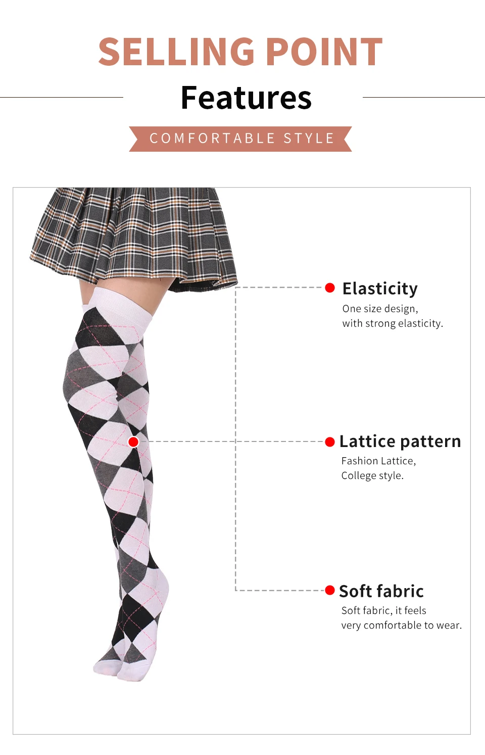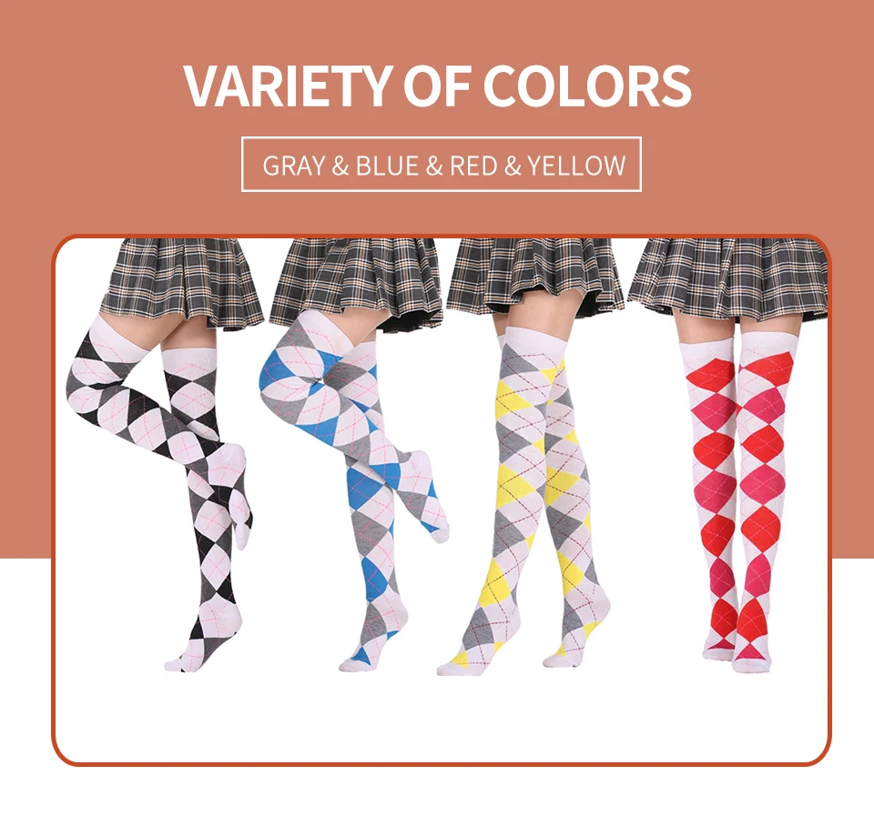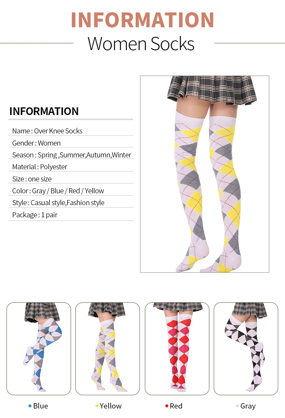 Женские осенне-зимние чулки, клетчатые дышащие красочные модные женские чулки выше колена из полиэстера в стиле Харадзюку с ромбовидной решеткой