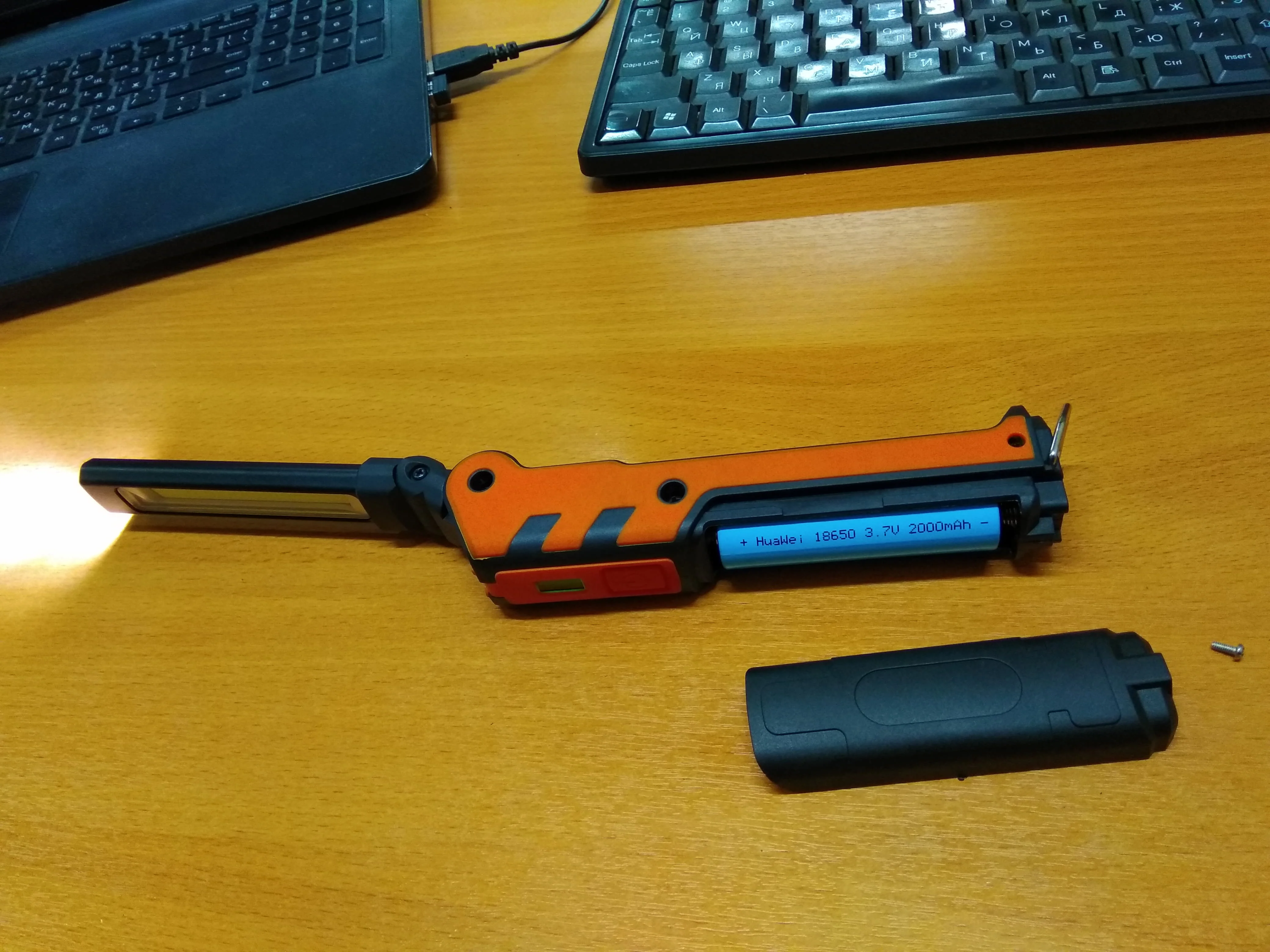 Фонарь порадовал качеством и функционалом. Аккумулятор 18650 был в комплекте емкостью 2000мач (емкость я не проверял). Аккумулятор можно легко менять, он находится под крышкой, которая снимается при откручивании маленького винта. Т.е. при наличии нескольких аккумуляторов 18650 и маленькой отвертки - можно долго оставаться со светом. На фонаре есть индикация уровня заряда из 5 светодиодов. Есть микро юсб порт для зарядки. Кстати, во время зарядки фонарь работает, т.е. можно заряжать и светить от повер банка. Для крепления на что либо есть магнит и крюк. Единственный минус - отгибающаяся часть со светодиодами плохо держится в гнезде поэтому надел резинку. Фонарь покупался для освещения рабочей зоны. Я доволен. Спасибо