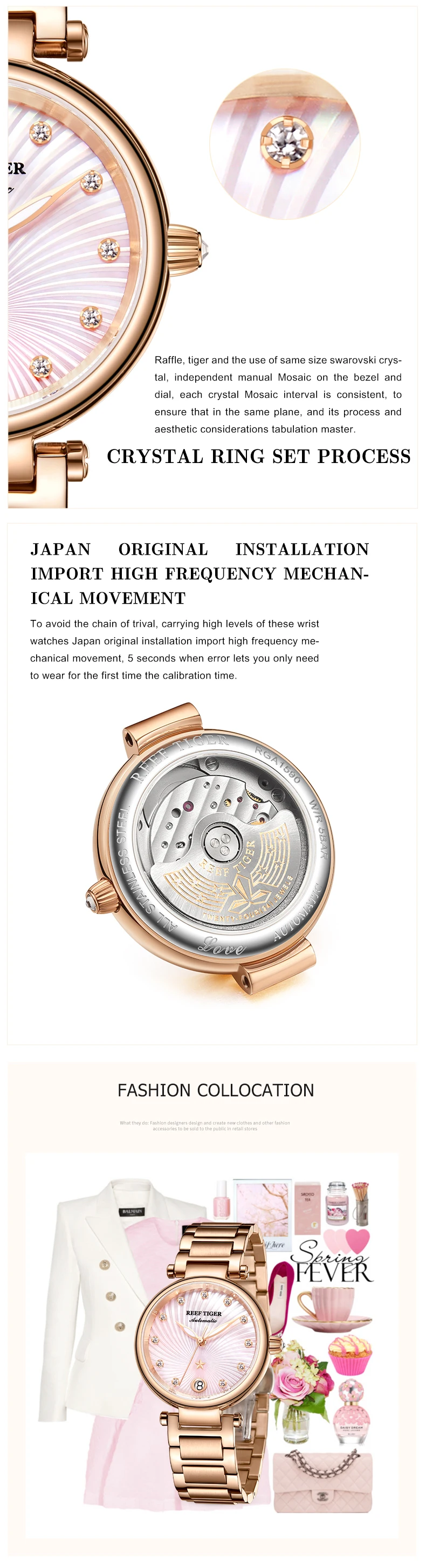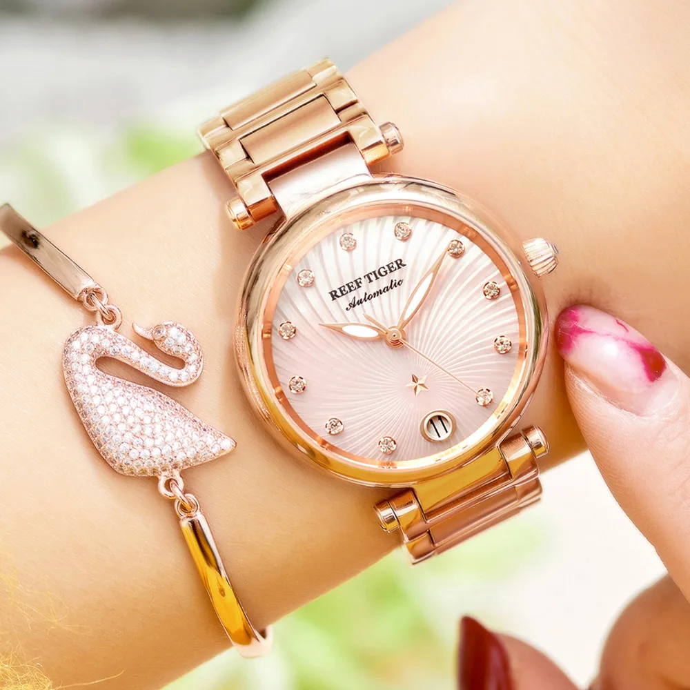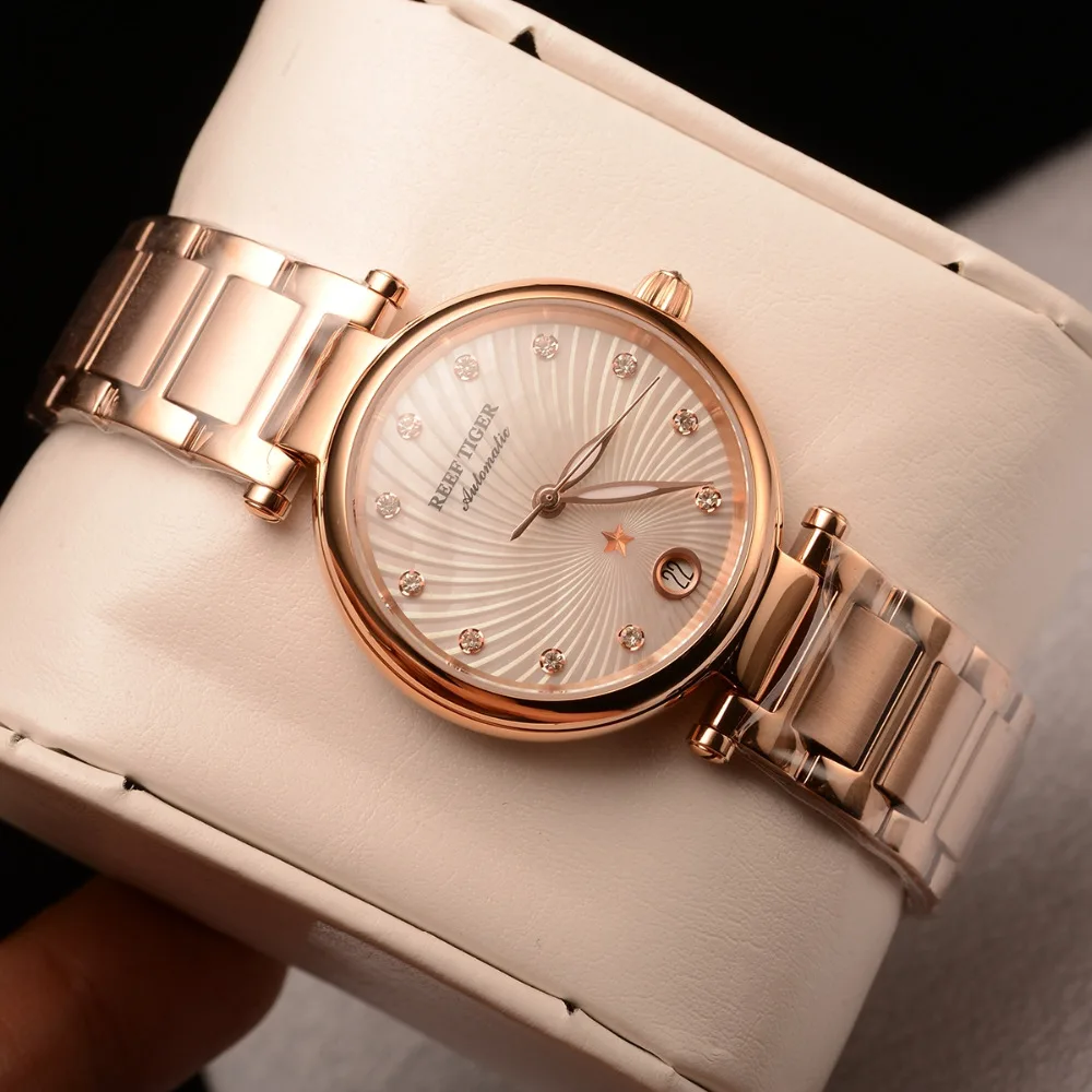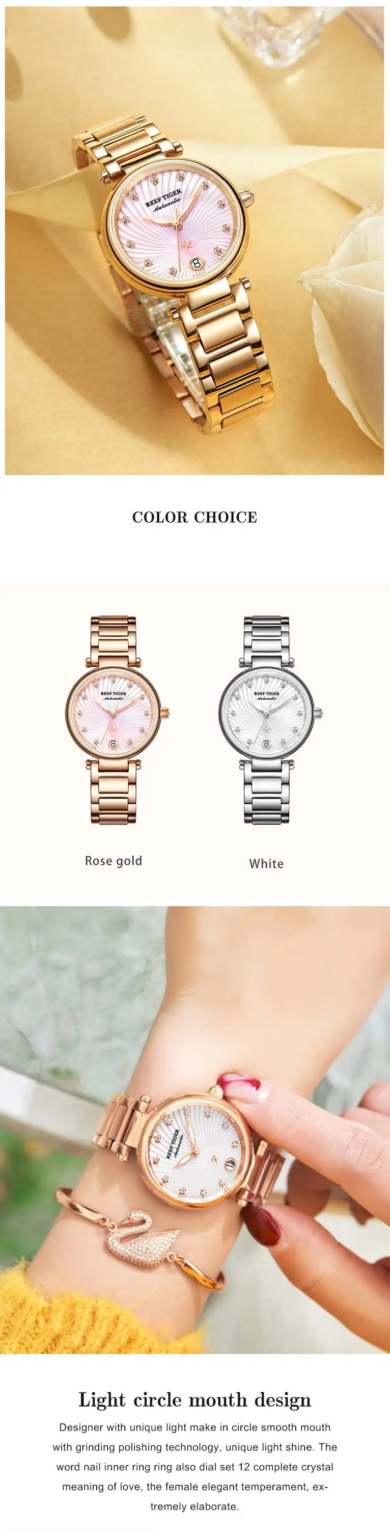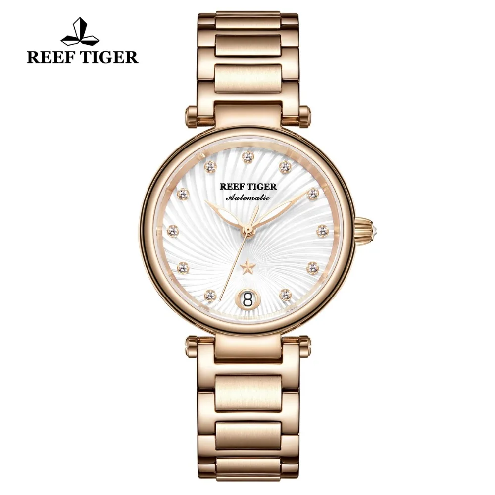 Женские часы с автоподзаводом Reef TigerRT, часы из розового золота с белым циферблатом и бриллиантами, женские часы с браслетом RGA1590
