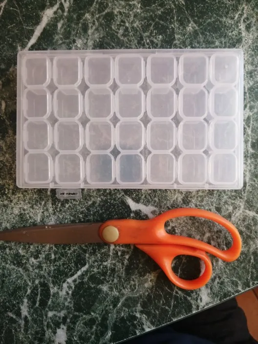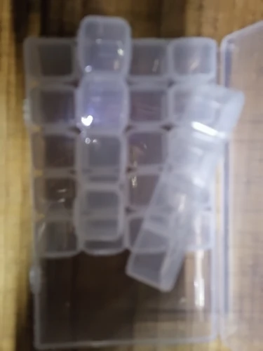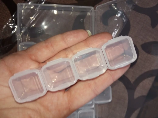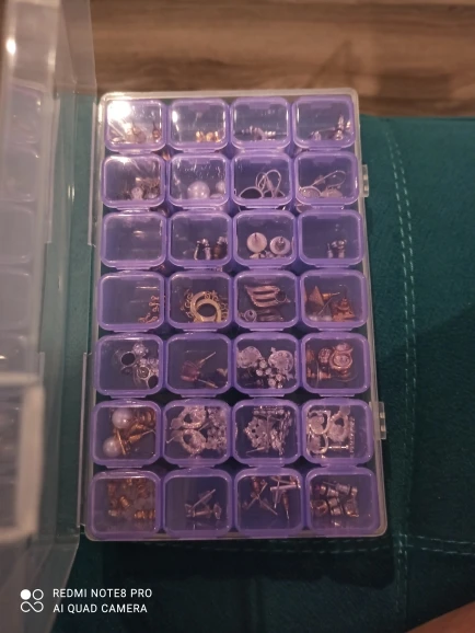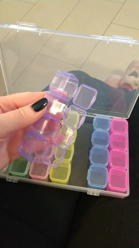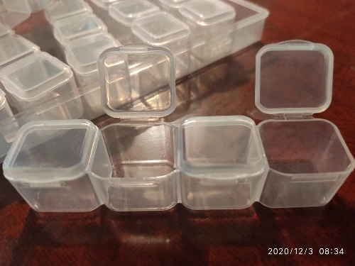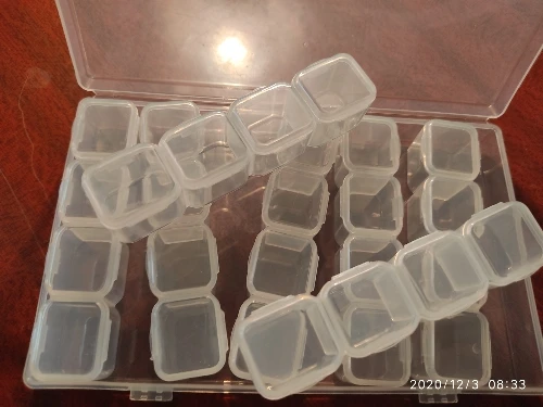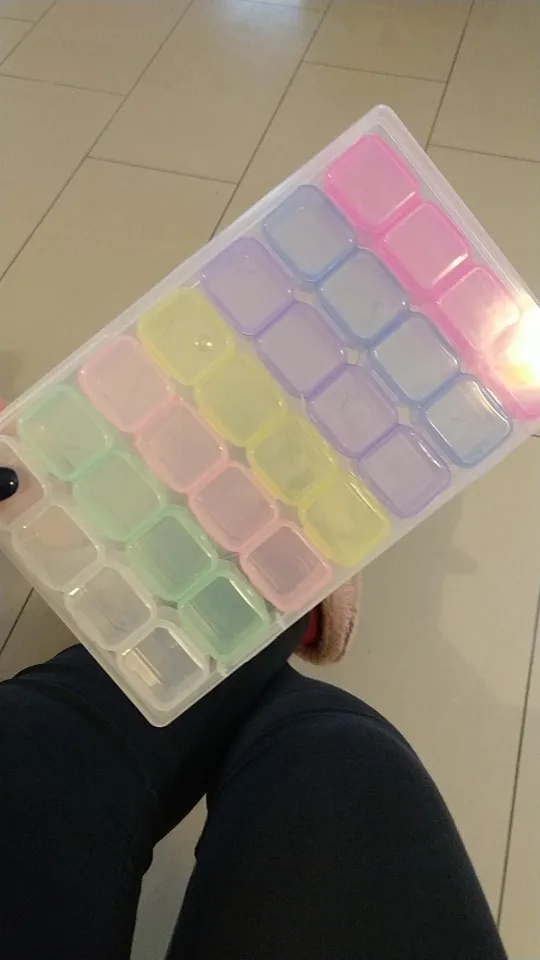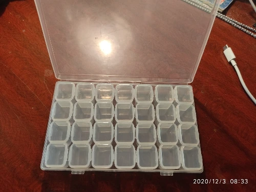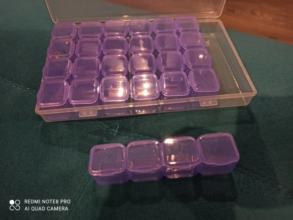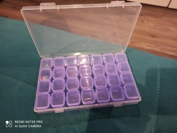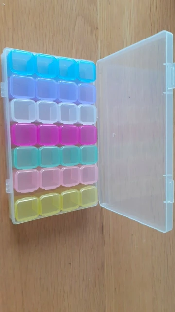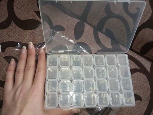 Описание очень точное. Это пластиковая коробка с плотно закрывающейся крышкой, внутри которой 28 маленьких контейнеров, каждый из которых также закрывается крышечкой. Контейнеры соединены между собой по 4 штуки. Крышки на контейнерах закрываются очень крепко, поэтому можно безбоязненно хранить там мелкие стразики, блёстки, бусинки, само не откроется, не рассыпется и не потеряется. Доставка в Узбекистан заняла 50 дней. Трек отслеживался только до страны транзита, затем уже нет, целый месяц не было обновления. Всё пришло в целости, не мятое, не сломанное. Упаковано в обычную пупырку. Товаром довольна, замечаний нет, рекомендую.