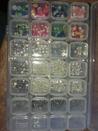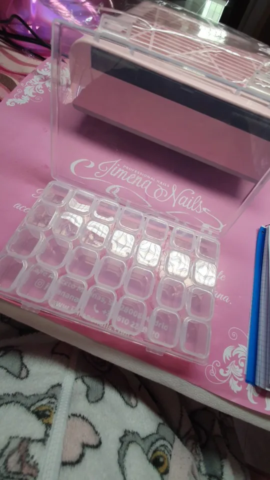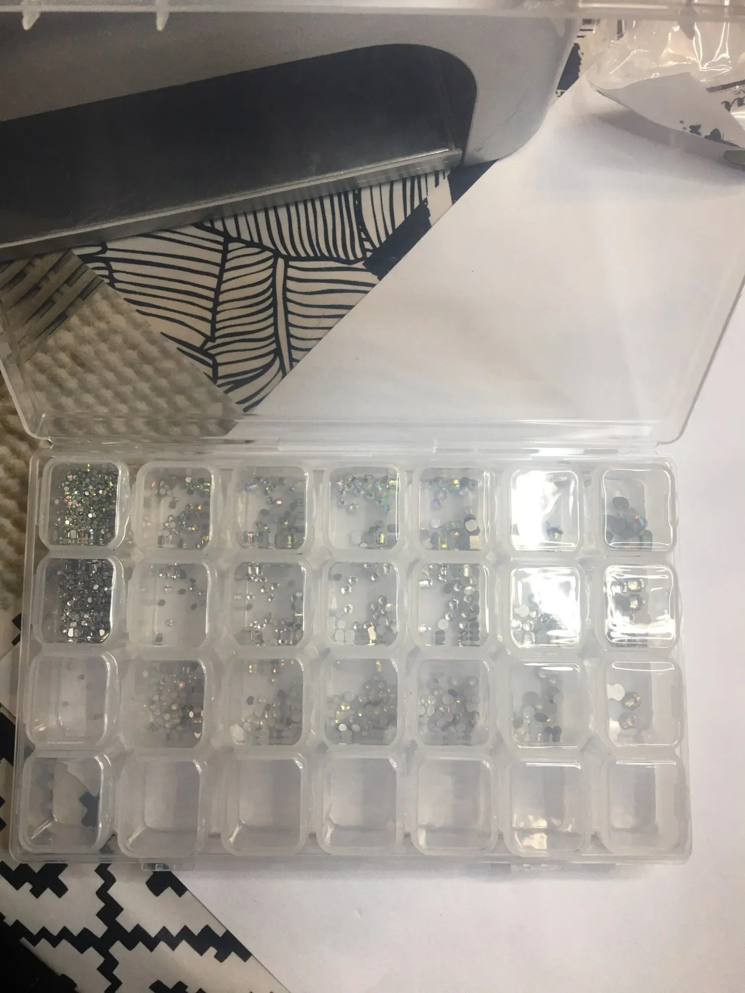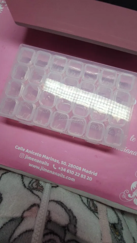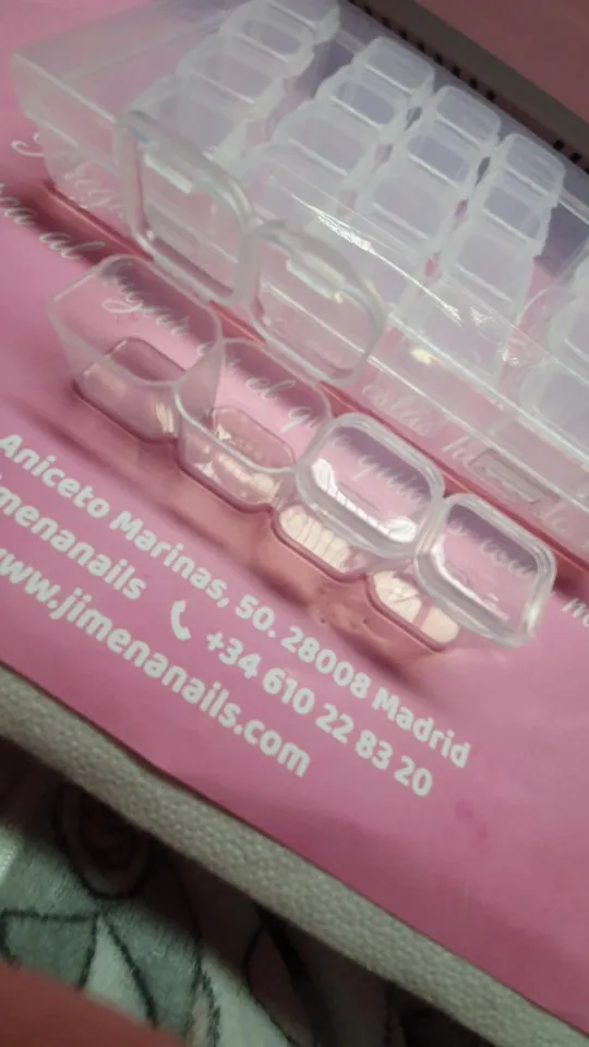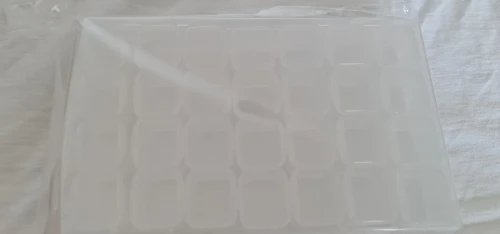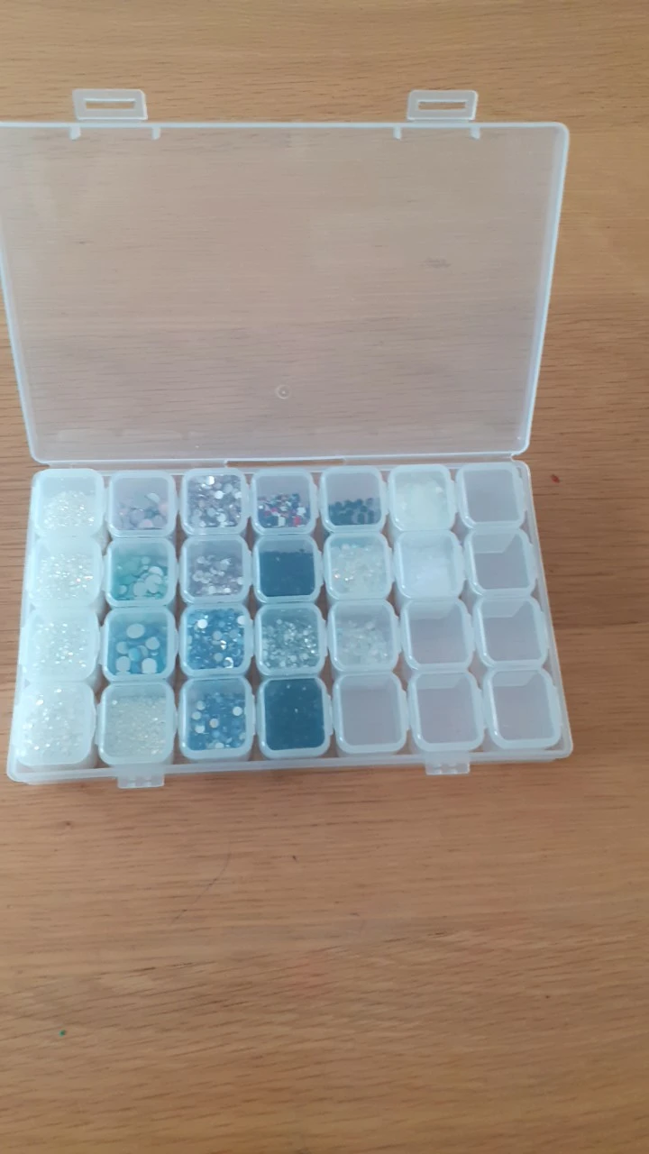 Описание очень точное. Это пластиковая коробка с плотно закрывающейся крышкой, внутри которой 28 маленьких контейнеров, каждый из которых также закрывается крышечкой. Контейнеры соединены между собой по 4 штуки. Крышки на контейнерах закрываются очень крепко, поэтому можно безбоязненно хранить там мелкие стразики, блёстки, бусинки, само не откроется, не рассыпется и не потеряется. Доставка в Узбекистан заняла 50 дней. Трек отслеживался только до страны транзита, затем уже нет, целый месяц не было обновления. Всё пришло в целости, не мятое, не сломанное. Упаковано в обычную пупырку. Товаром довольна, замечаний нет, рекомендую.