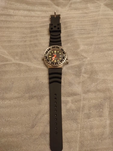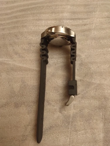 Однотонный ремешок... немного жестковат .... но выглядит отлично .. мне нравится Пряжка... Отлично подходит для Seiko или citizen divers