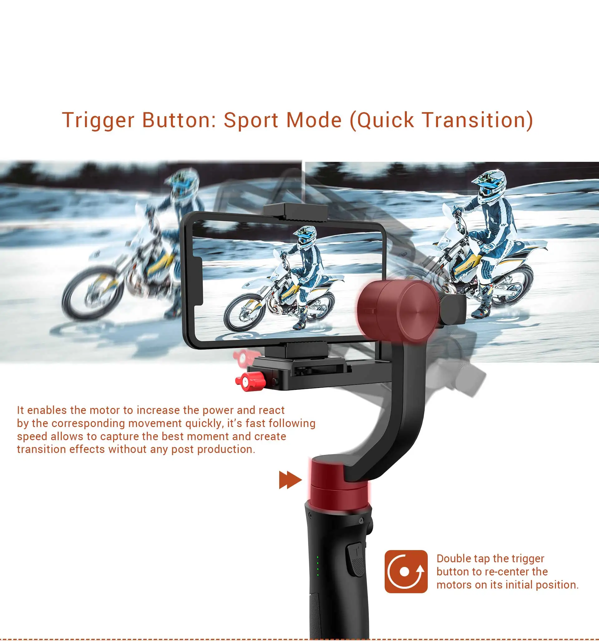 Новая модель добавляет на одну кнопку триггера обратную сторону с гораздо большим количеством работы на этом шарнире, дважды нажмите кнопку триггера, чтобы повторно центрировать двигатели на начальном положении; он позволяет двигателю увеличить мощность и быстро реагировать на соответствующее движение, Быстрая следующая скорость позволяет запечатлеть лучший момент и создать эффекты перехода без какого-либо постпроизводства.