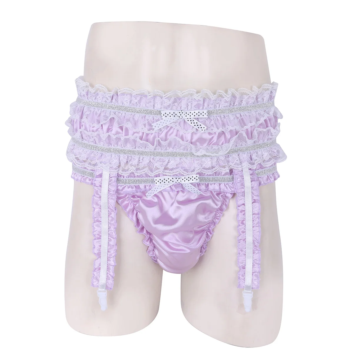 Сексуальные мужские трусы-бикини, нижнее белье, мягкое, блестящее, атласное, гофрированное, с оборками, низкая посадка, тянущиеся, Sissy, мужское нижнее белье, трусики с подвязками