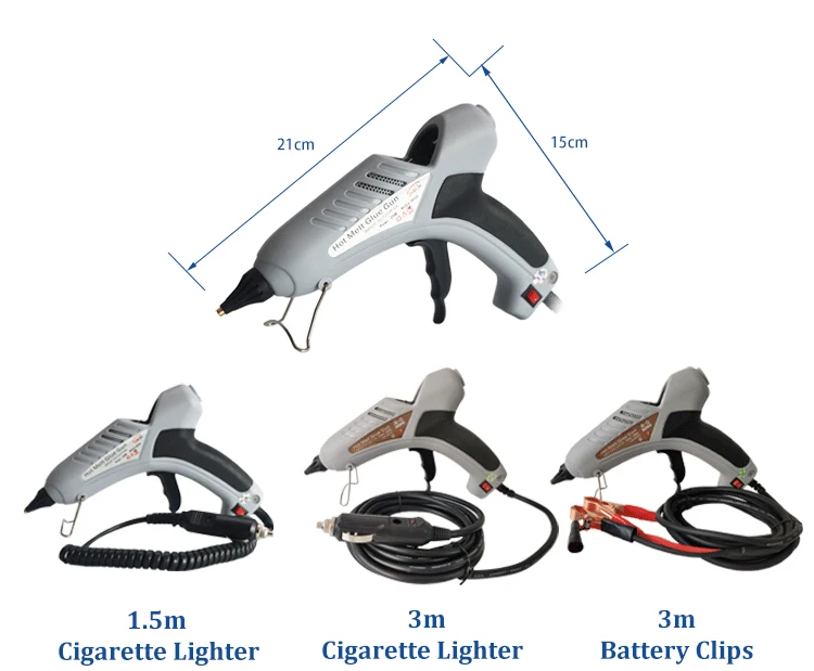 4. Форма клеевого пистолета изготовлена из высокотемпературного изоляционного пластика. Оснащен световым питанием и длиной 1,5 м/3 м шнур питания с зажимом для прикуривателя/аккумулятора. С автоматической постоянной температурой, источник питания безопасный, длительный срок службы характеристики.