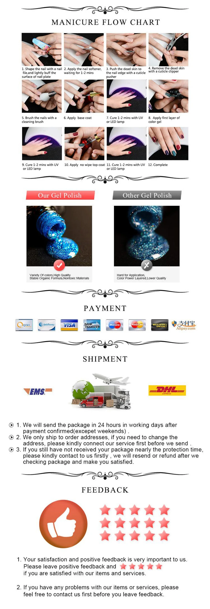 Параметры: * Объем: 5 мл * Цвет: 12 цветов * Посылка: гель для ногтей * Тип: охрана окружающей среды, изготовлен из натурального полимерный гель (гель + натуральный сушеный цветок) Отмачиваемый УФ-Гель-лак, необходимо использовать с верхним базовым покрытием, высушить УФ-светодиодный светильник Особенности: * Идеально подходит для создания собственного красивого дизайна ногтей на пальцах или носках; * Подходит для использования с другими изделиями для дизайна ногтей; * Можно использовать как на искусственных ногтях, так и на натуральных ногтях; * Краски могут быть использованы на различных поверхностях, таких как ногти, бумага и другие произведения искусства; * Подходит для профессионального или домашнего использования. Инструкции по использованию: 1. Чистый, маникюр 2. Нанесите грунтовку, Осветите 1-2 минуты 3. Нанесите слой сухого цветочного клея, Осветите 1-2 минуты 4. Нанесите слой сухого цветочного клея, Осветите в течение 1-2 минут.