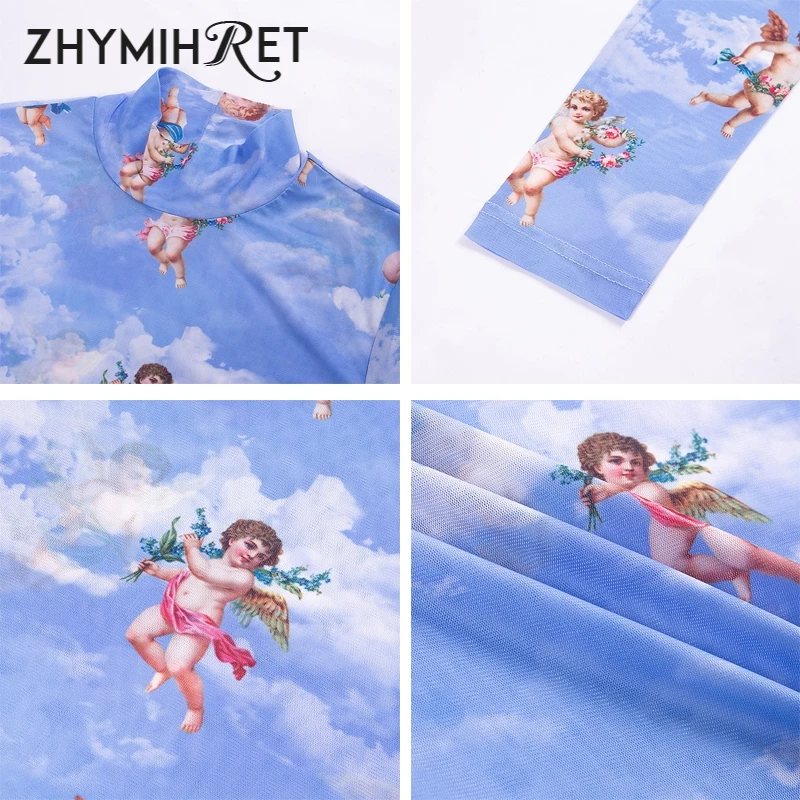 Женская футболка с длинным рукавом zhymifret, сетчатый укороченный топ с принтом амупида и ангела, уличная одежда, весна 2019