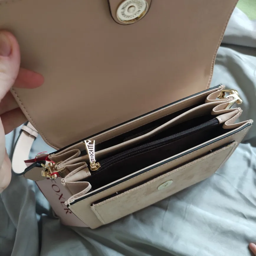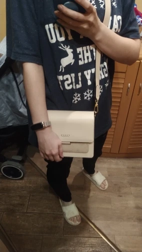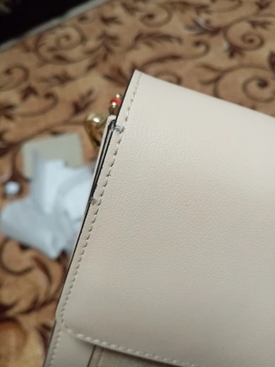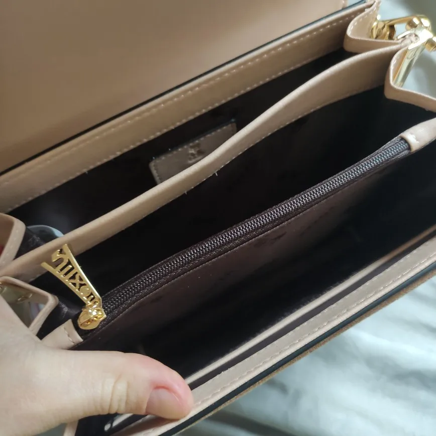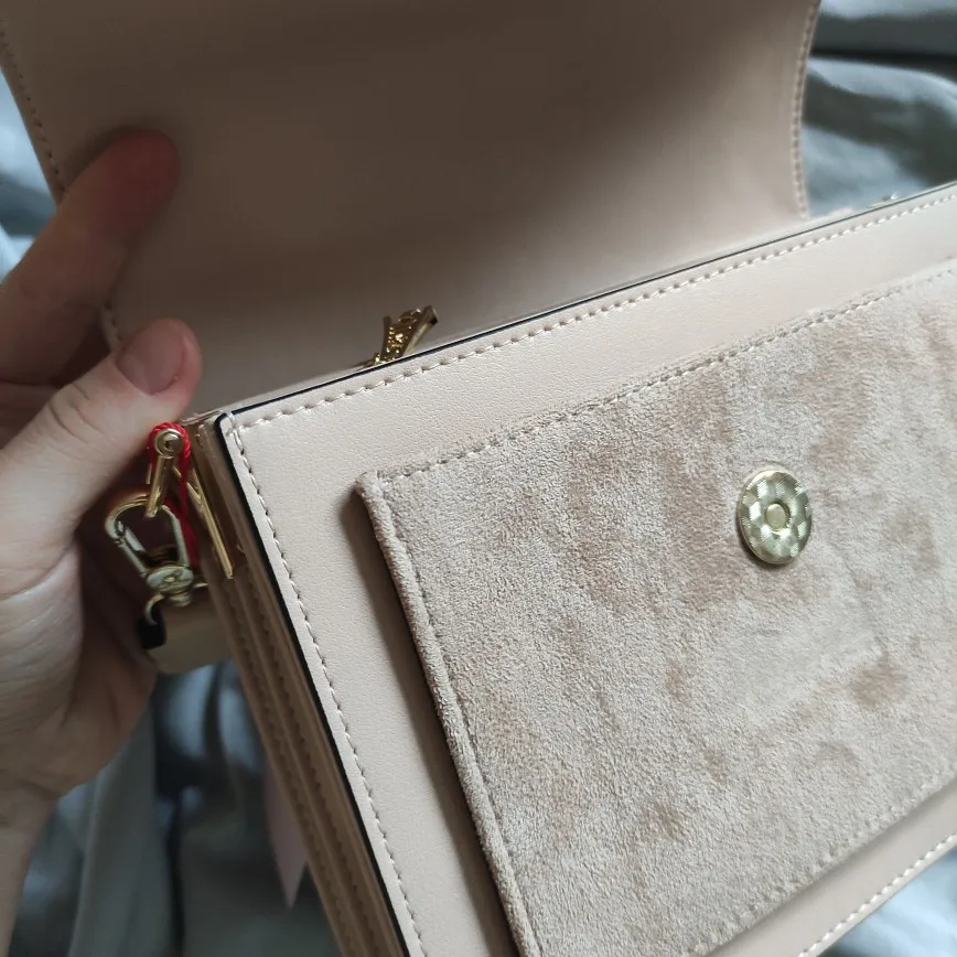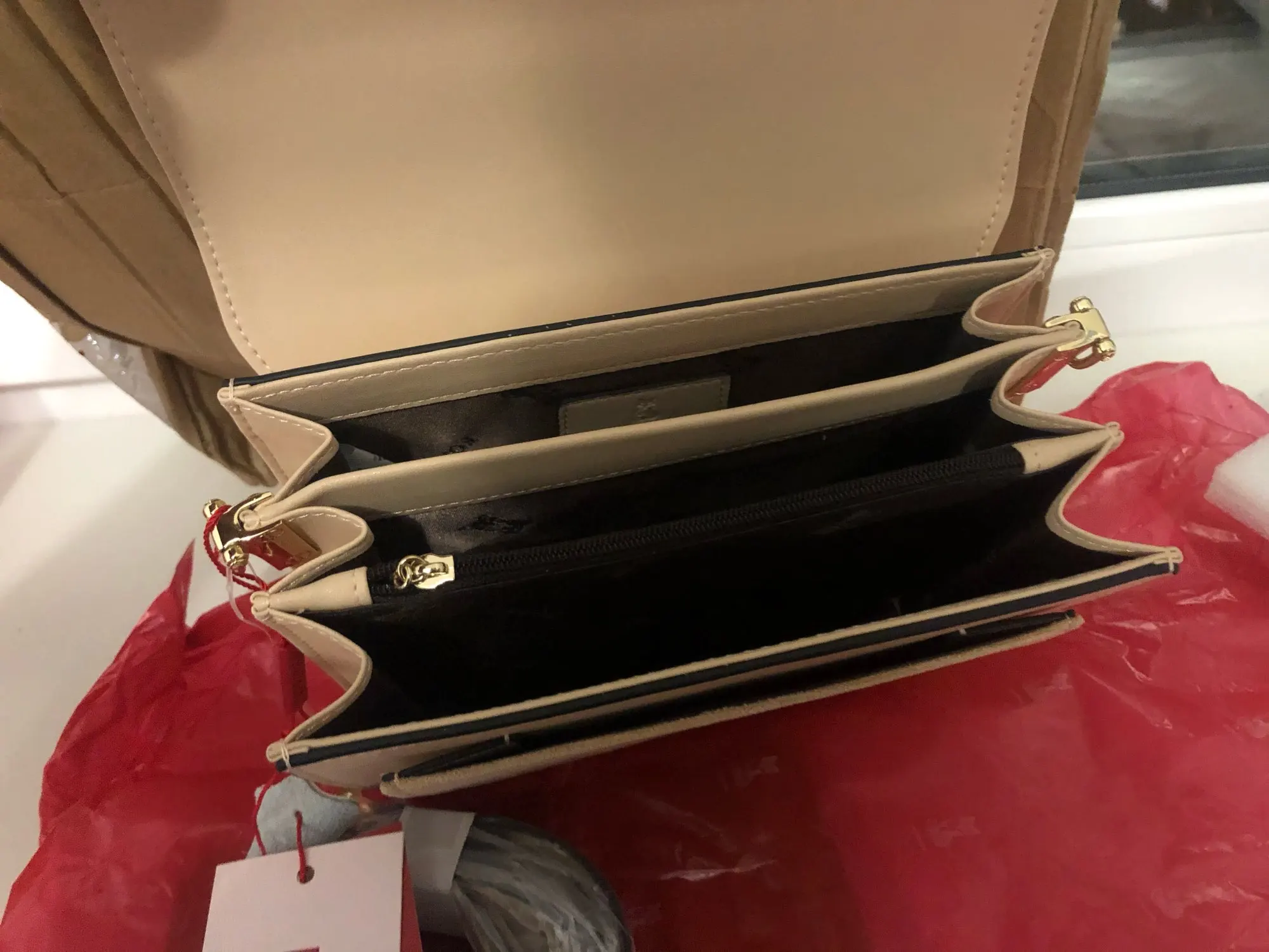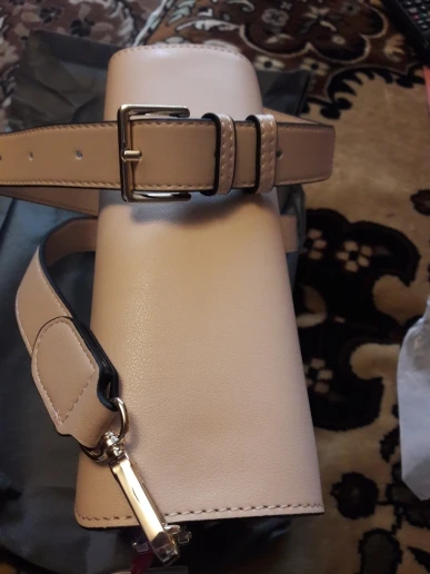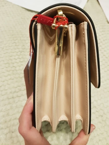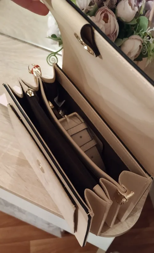 Сумочка шикарная. Доставка около месяца, упакована была надежно в картонную коробку. Дошла в идеальном состоянии. Фирменный пыльник и ремень в комплекте. Красивый цвет - нюдовый беж. Смотрится дорого и элегантно, подойдёт и на выход и на каждый день. Единственный нюанс - действительно чуть косо смотрится закрывающаяся часть (видно на втором фото)... прочитала, что такая проблема у всех, видимо лекало кривое, по которому отшивают)) но это в глаза не бросается особо, так что всех достоинств не перечеркивает.
