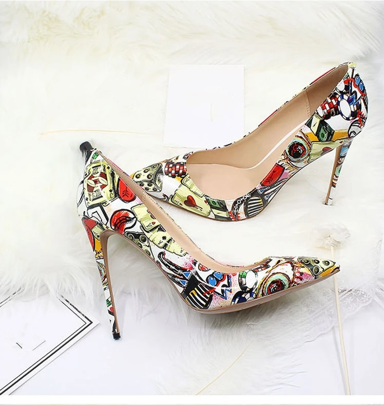 Туфли-лодочки женские на шпильке, пикантные, заостренный носок, лакированная кожа, принт, высокий тонкий каблук, большой размер, D004C, на весну