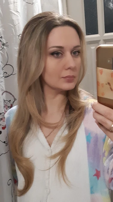 Очень красиво, и в целом продукт выглядит отлично! Но если у вас тонкие волосы, трудно скрыть линию между вашими волосами и началом наращивания. Он очень толстый Очень быстрая доставка!