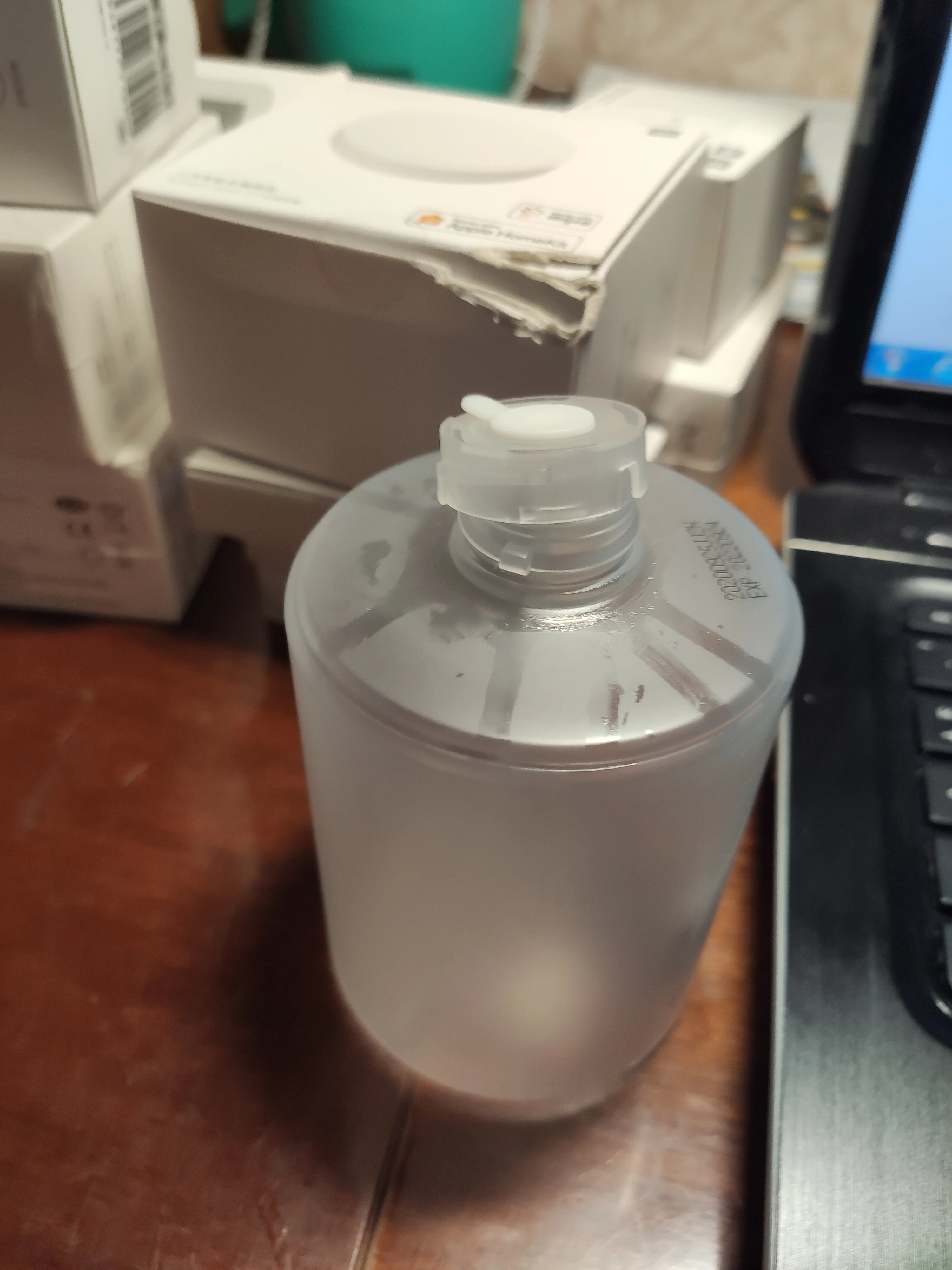Доставлен абсолютно целым, работает на четырех батарейках AA. Сразу для удобства дальнейшей заправки подрезал два зацепа из четырех на крышке ёмкости. Изначально заправил жидким мылом - не заработал, затем развел с водой в равной пропорции - получилась шикарная пена