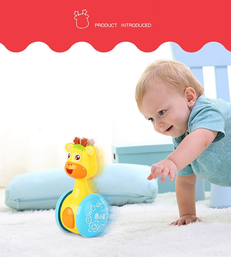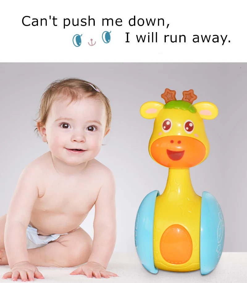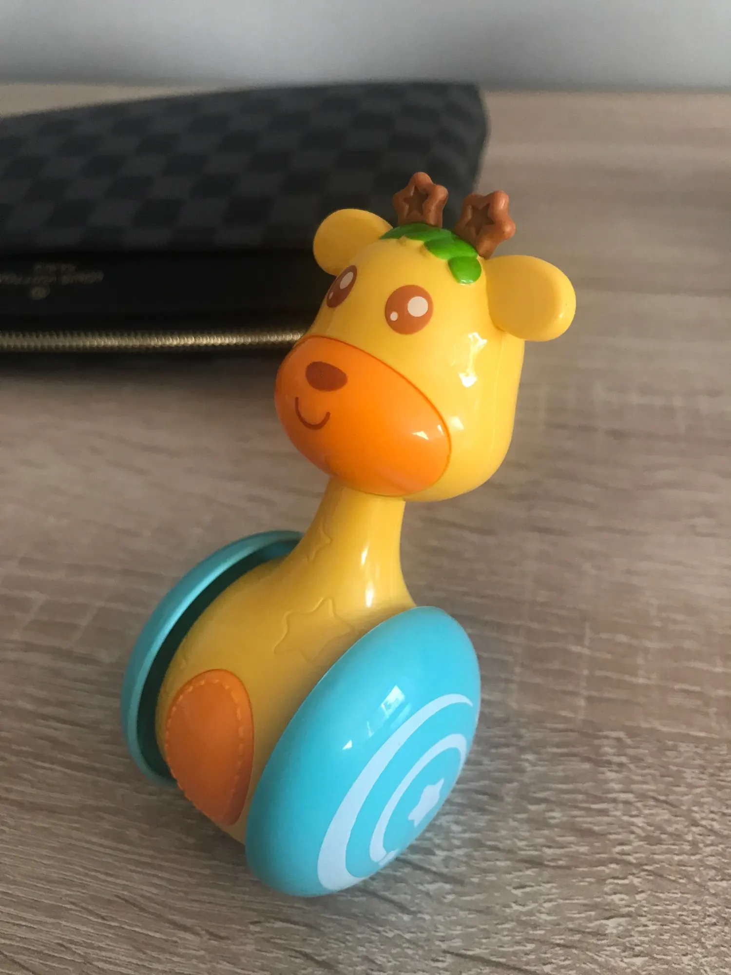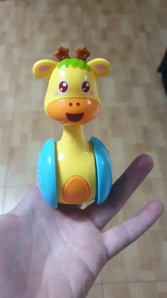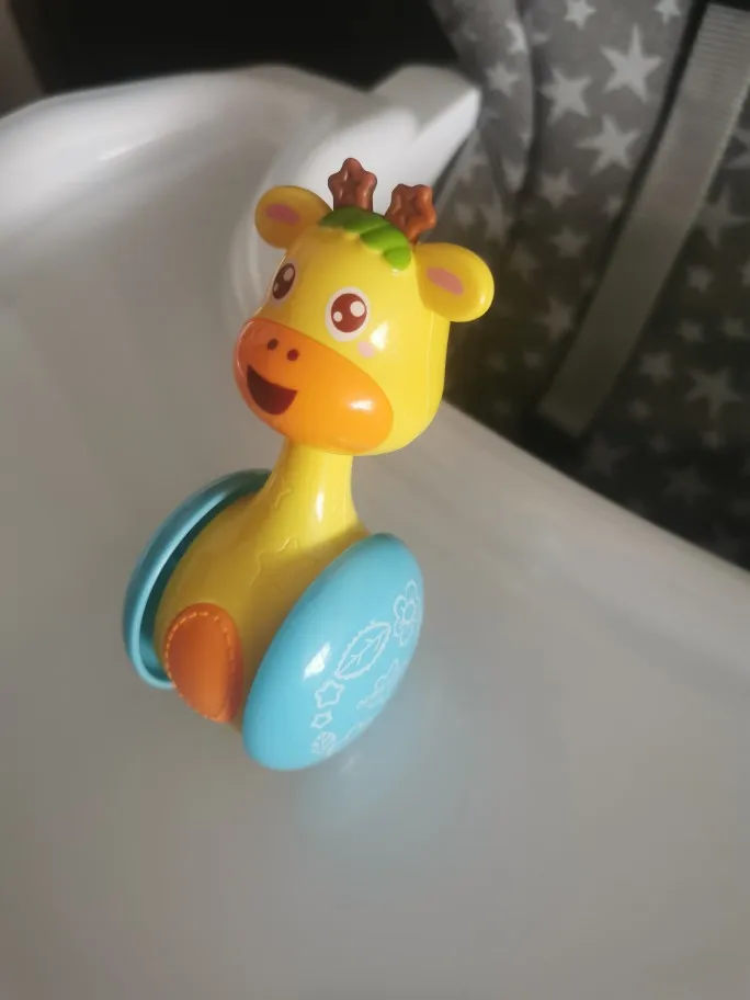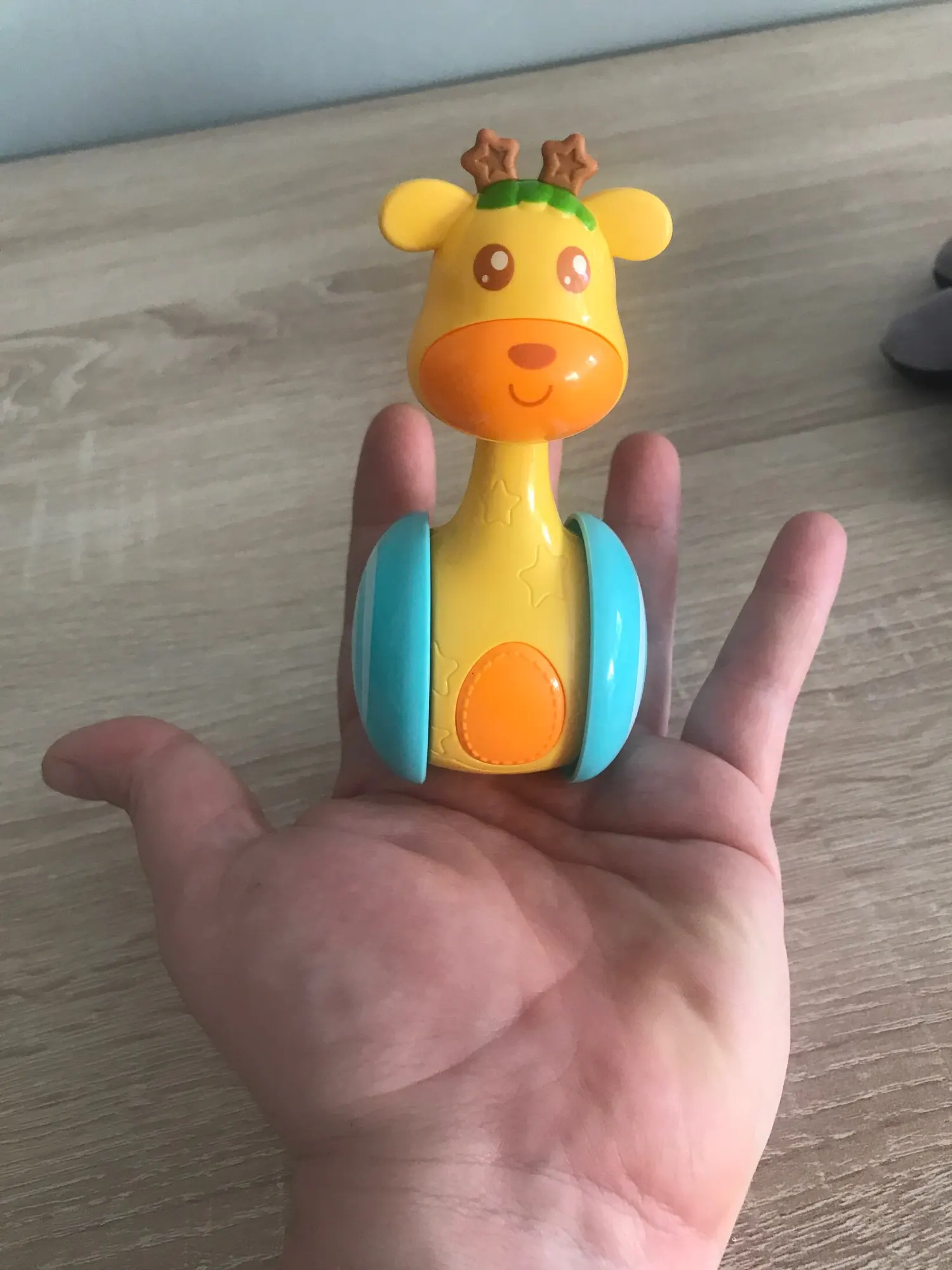 отличная игрушка! полностью соответствует видео и фото, но на заглавном фото товар зачем-то сделан больше по сравнению с ребенком. Чтобы понять настоящий размер, посмотрите видео. Малышу в 4,5 месяца нравится, пытается дотянуться, дотрагивается, а жираф отъезжает. Надеюсь, вдохновит на ползание :)