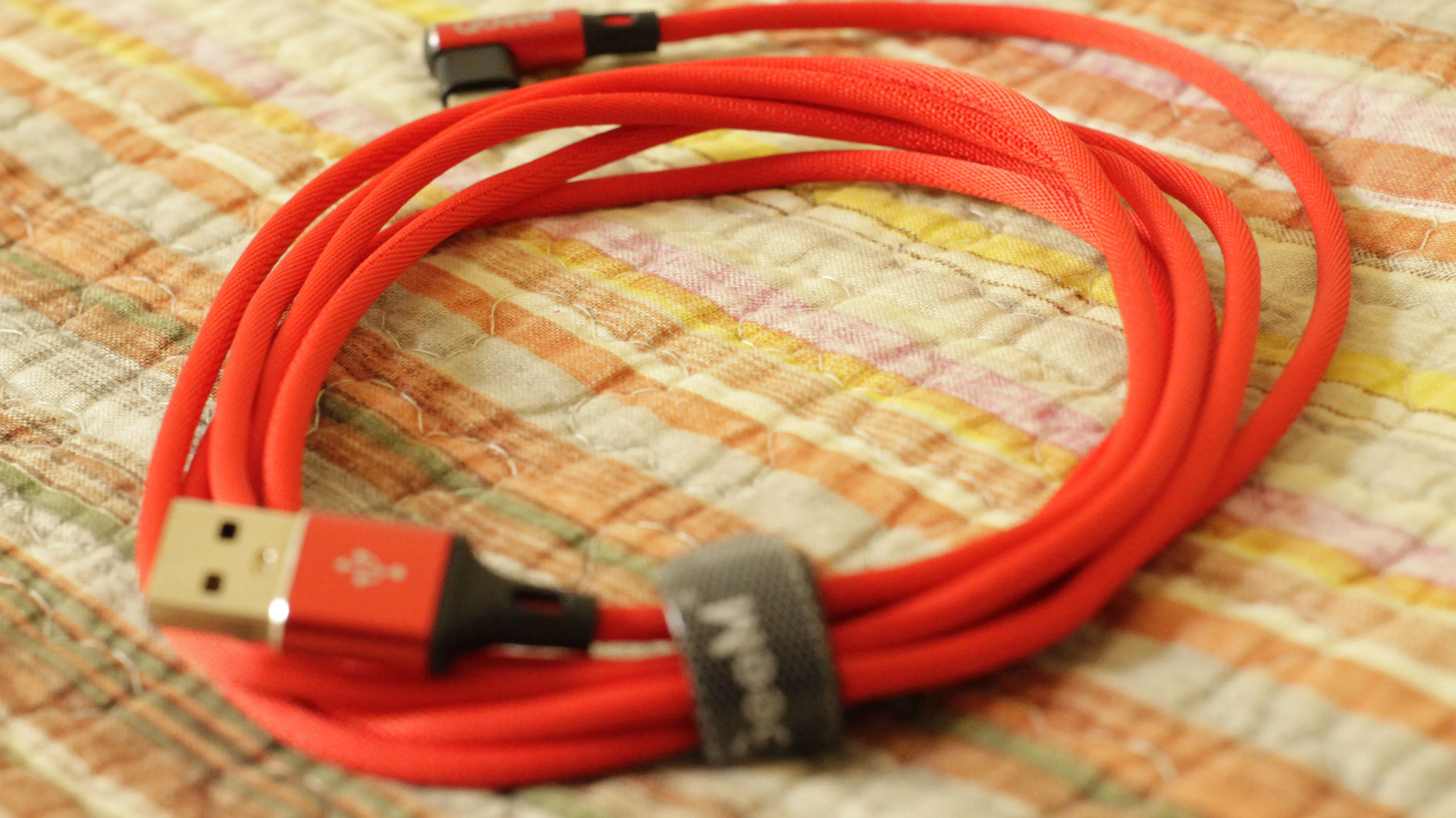 Профессиональная упаковка на молнии создает отличное первое впечатление. Яркий цвет и контрастность шнура черного и красного цветов делают шнурок особенным. Тканевая оплетка-это тонкая плетеная оплетка, а провод немного жестче, чем я хотел бы-от наличия других обычных плетеных шнуров. Это, скорее всего, из-за типа и качества провода внутри, но я не могу видеть внутри. Мы видим только снаружи. Однако он по-прежнему достаточно гибкий. Отлично заряжает устройства. Поставляется с небольшим держателем шнура на липучке,