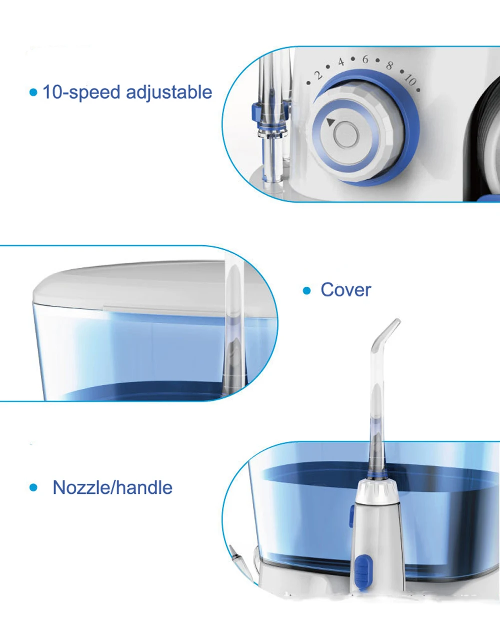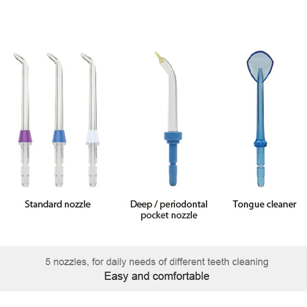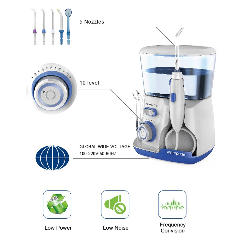 Водная Флоссер V300 оставляет зубной налет и остатки между зубами и ниже линии gumline. 10 настроек давления воды позволяют настроить мягкую и глубокую очистку. 5 уникальные советы по работе Специализированные, в то время как емкость объемом 800 мл уменьшает потребность в заправках.