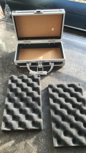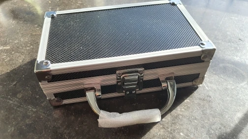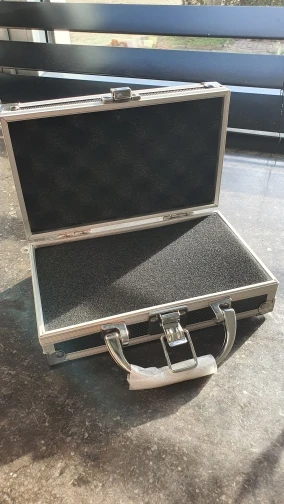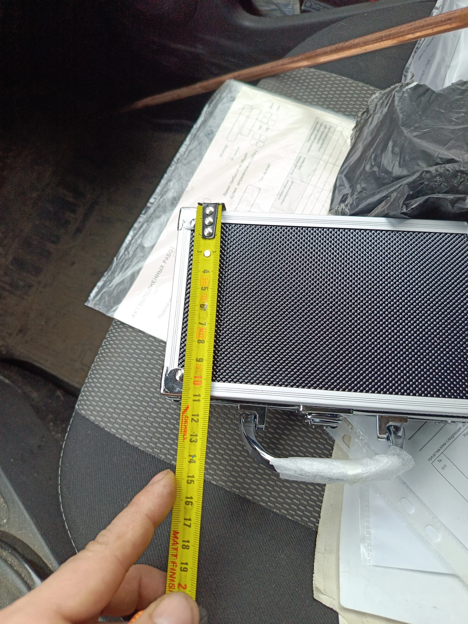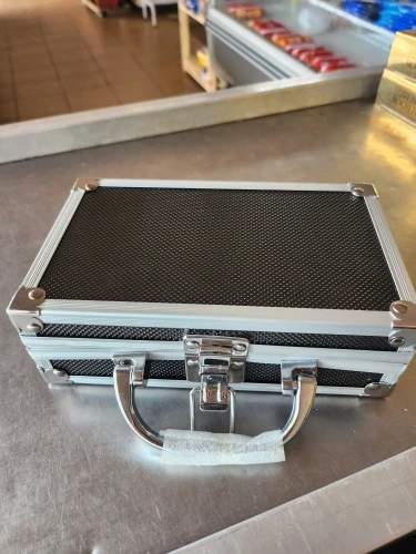Шкатулка ввиде чемоданчика 10,5 см х 7.5 см. Легкая алюминиевая. Выглядит более менее аккуратно. Но обращайте внимание на размер!