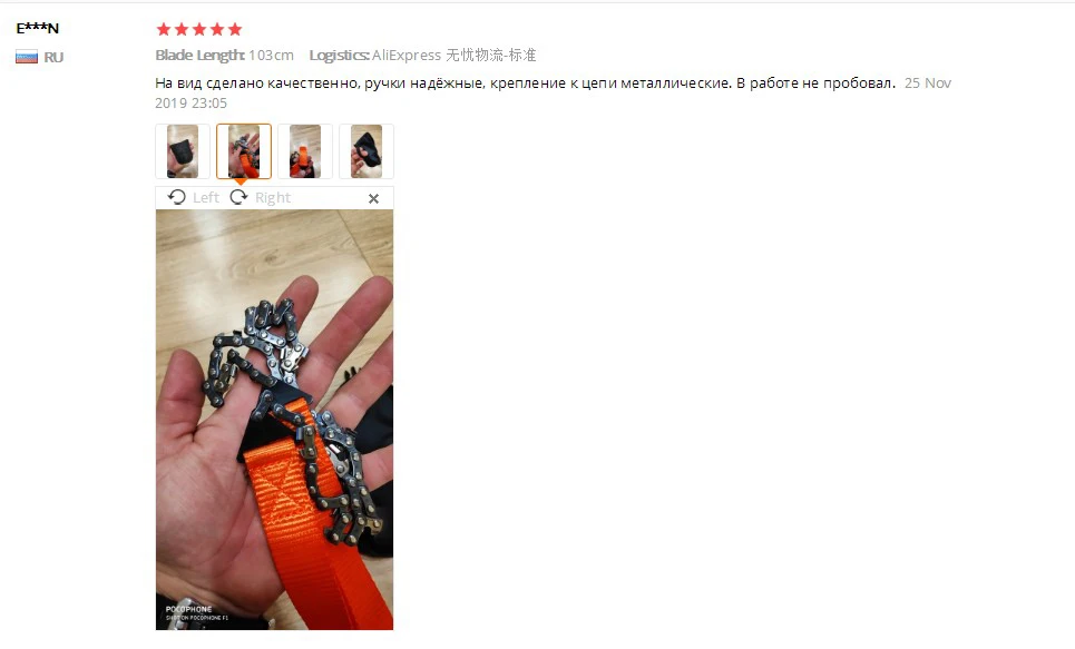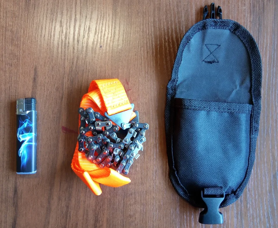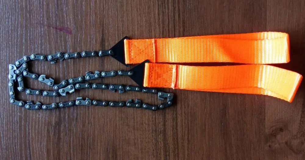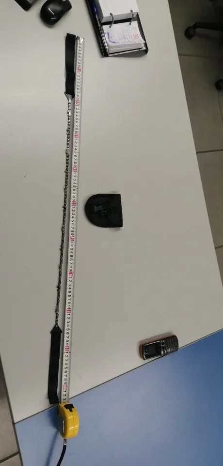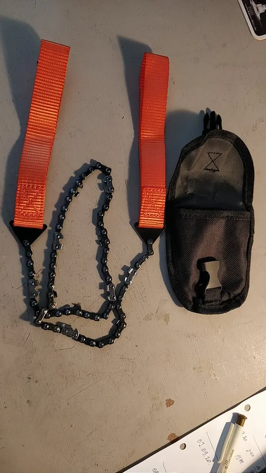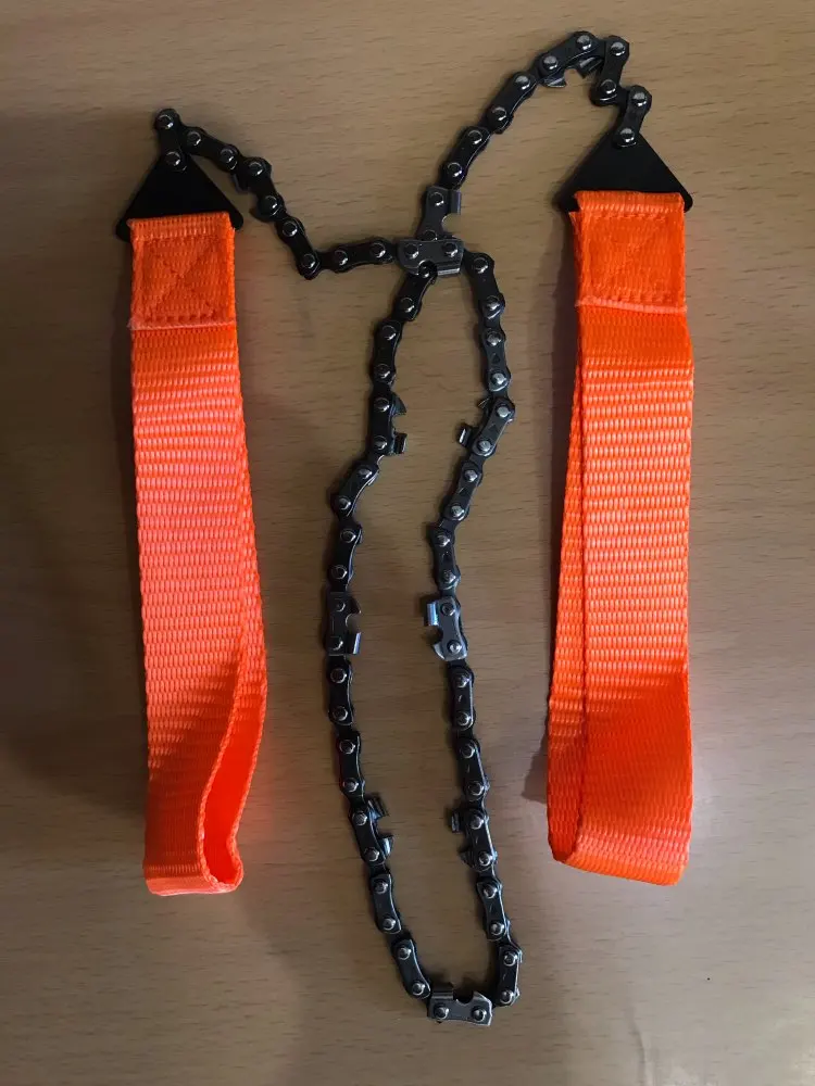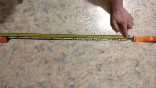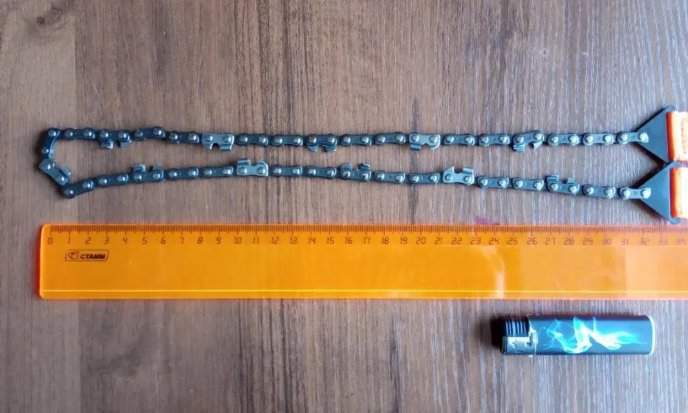 с виду пила выглядит норм ,брака не обнаружил , смущает толщина самих звеньев ,но заклепаны хорошо, длина самой пилы 630 мм остальное оранжевые ручки тогда получается 1000 мм. компактная и лёгкая для походов самое то. на этой неделе постараюсь за тестить ,дополню отзыв .до Перми 45 дней ,с продавцом не общался.
