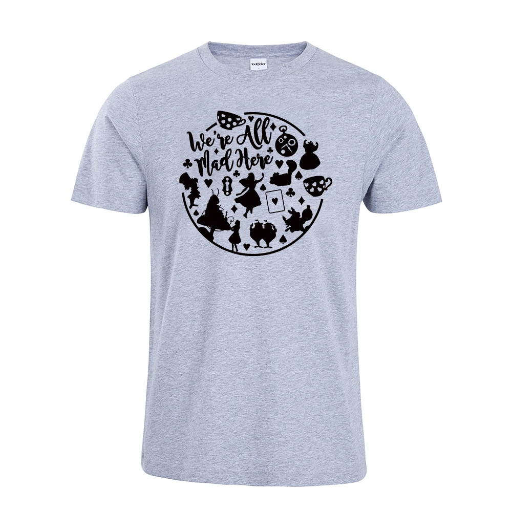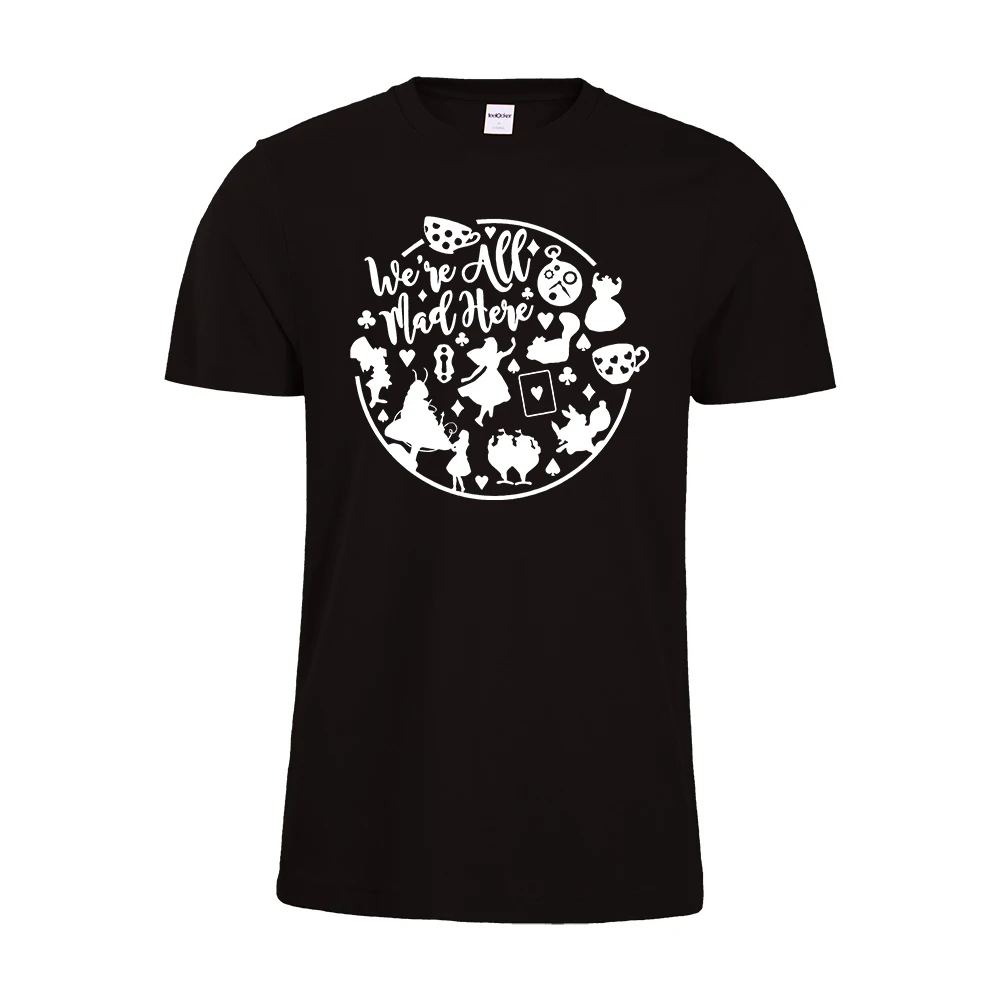Новое поступление 2020, мы все сумасшедшие здесь футболки, Alice Футболка Страна чудес, смешная футболка, Женские повседневные футболки с цитатами