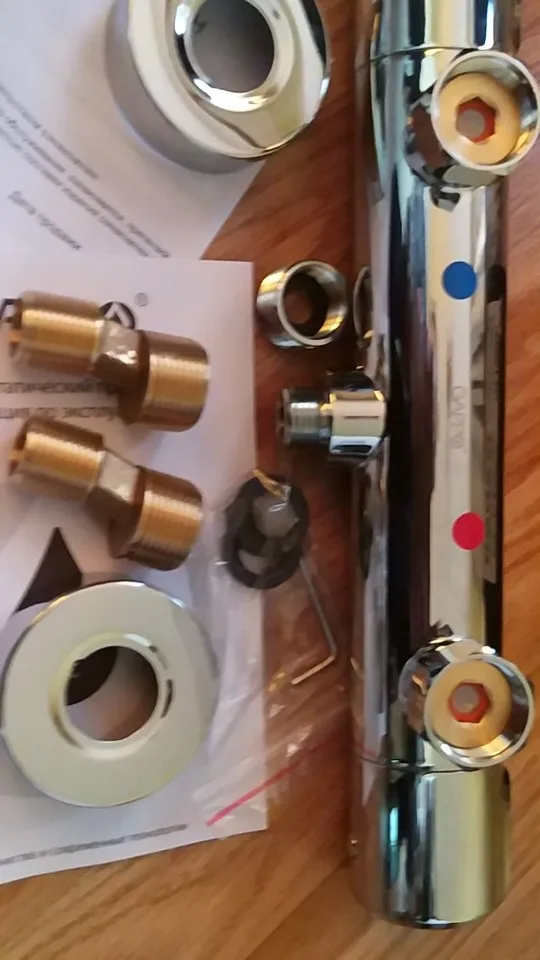 Пришел быстро. Работает нормально. В комплекте прокладки с сеточками, кроме того, в самом смесителе на входе стоят сетчатые фильтры. Из недостатков: нет никакой документации, нанесена едва различимая маркировка температуры и количества воды, чашки, закрывающие эксцентрики, хлипковаты, пришлось оставить от старого смесителя.