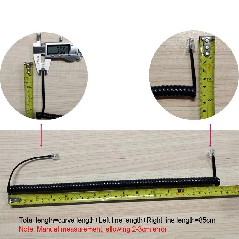 При нормальных условиях общая длина телефонной линии = длина изогнутой части около 68 см + длина левого конца около 10 см + длина правого конца 6 см. Таким образом, общая длина телефонной линии составляет около 80-85 см в нормальных условиях, а общая длина составляет 5 метров после того, как она была полностью втянута в прямую линию.