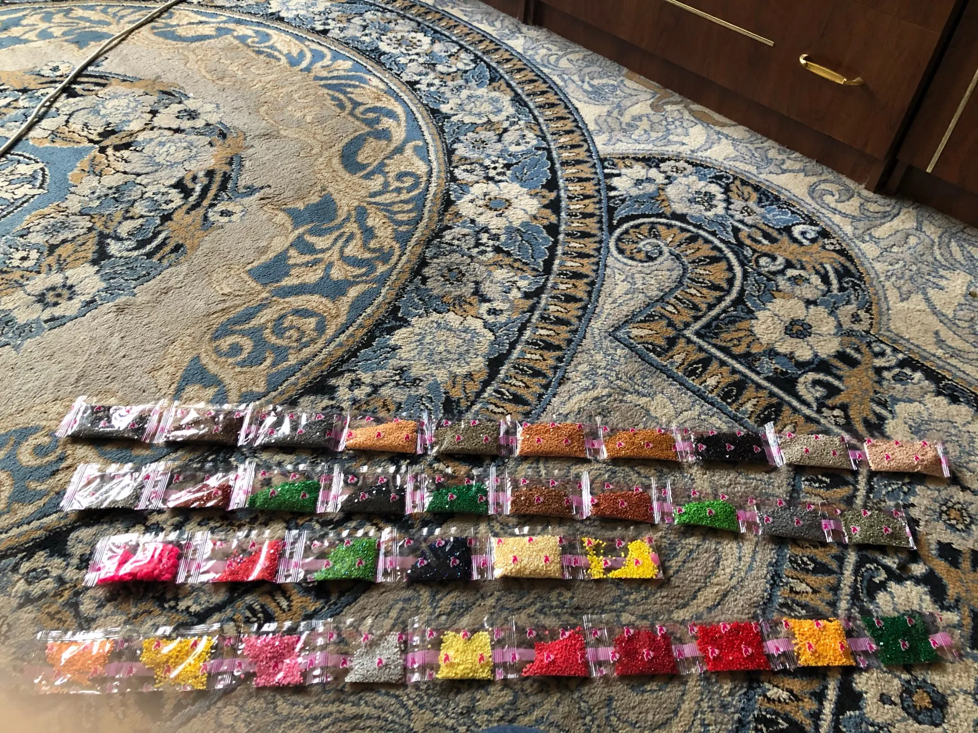 Посылка пришла довольно быстро, за 12 дней. Холст был намотан на плотный валик и завернут в пупырчатую пленку, заказ пришел без коробки несмотря на большие размеры. Заломов на холсте нет. Стразы яркие, красивые, есть 4 оттенка с перламутром - АВ стразы, и декор розочки. По количеству цветов все стразы в наличии. Фактический размер выкладки картины 52х72 см. Посылочка отслеживалась по всему пути вплоть до пункта выдачи. Рекомендую к покупке.