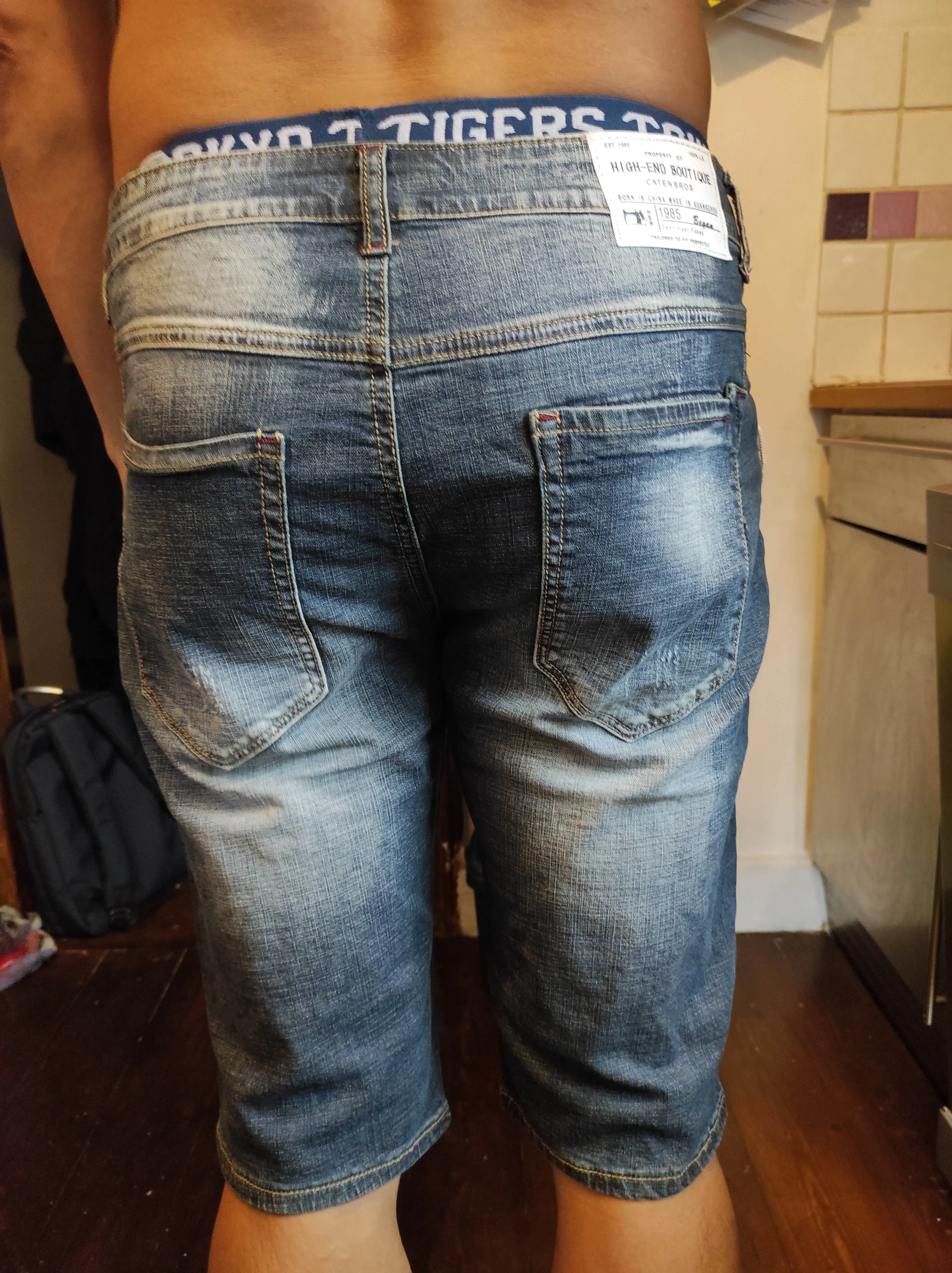 В целом качество хорошее. Обратная сторона грязно зеленого цвета, не как обычная изнаночная сторона джинс, но это не портит общий вид. По размеру, почитав отзывы, взял 33.. Или животы у людей, или все кг в пятой точке сосредоточены. На спортивные 80кг (180 рост) сидят очень свободно. Еще зависит от того кто как привык носить одежду. Я не люблю, когда ноги в шортах такого типа болтаются в шортах как карандаш в стакане, можно было смело брать 32 (хотя и не скажу. что эти сваливаются, но если дернуть, слезут не расстегиваясь), тянутся отлично. Сами шорты рекомендую, но внимательно подбирайте размер.