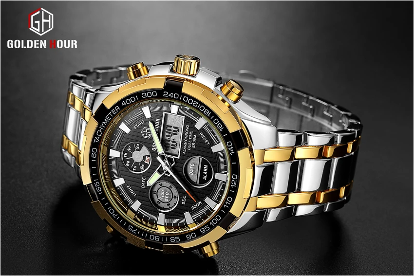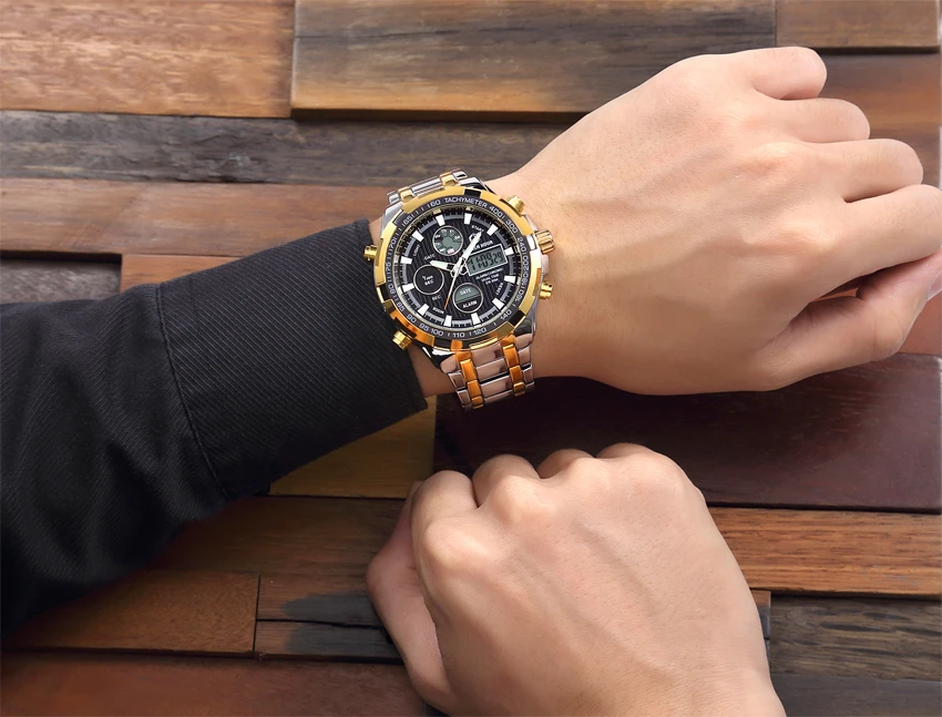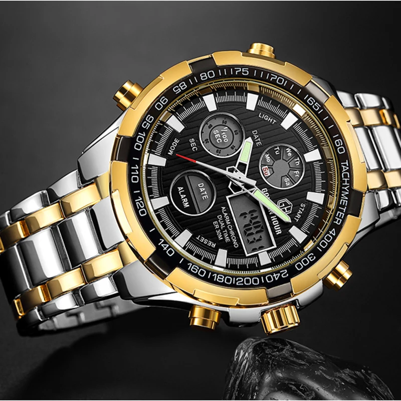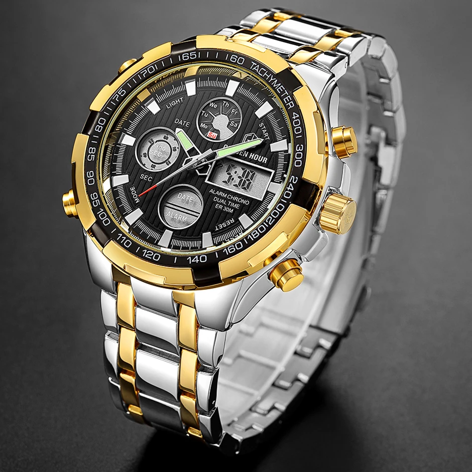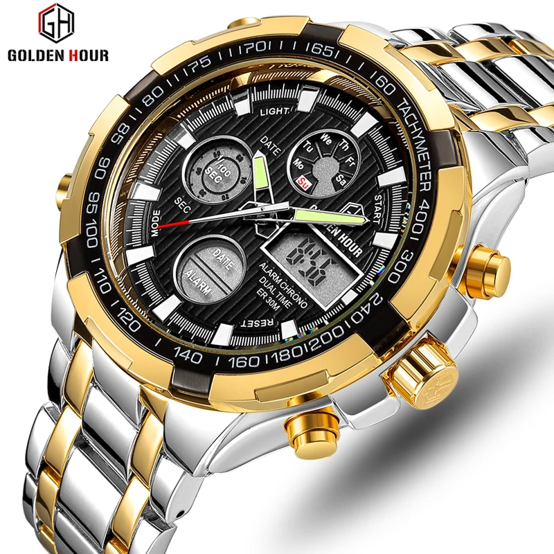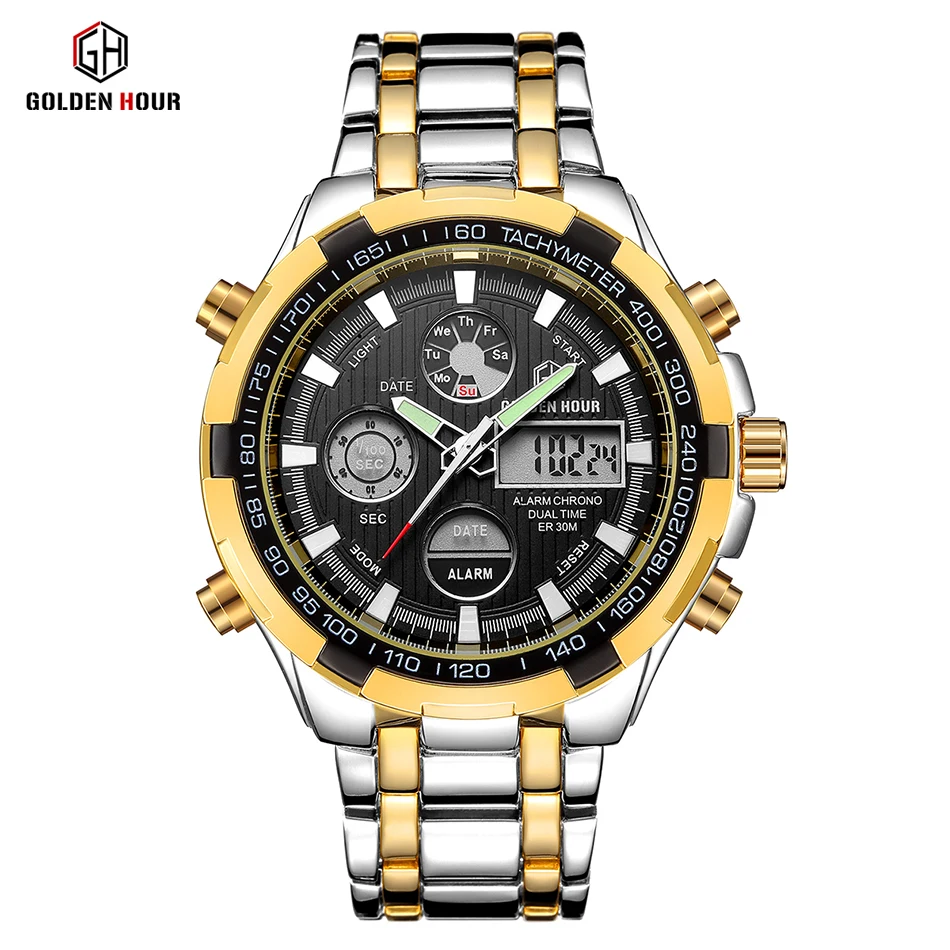 Часы наручные GOLDENHOUR Мужские кварцевые, брендовые аналоговые спортивные полностью стальные водонепроницаемые в стиле милитари