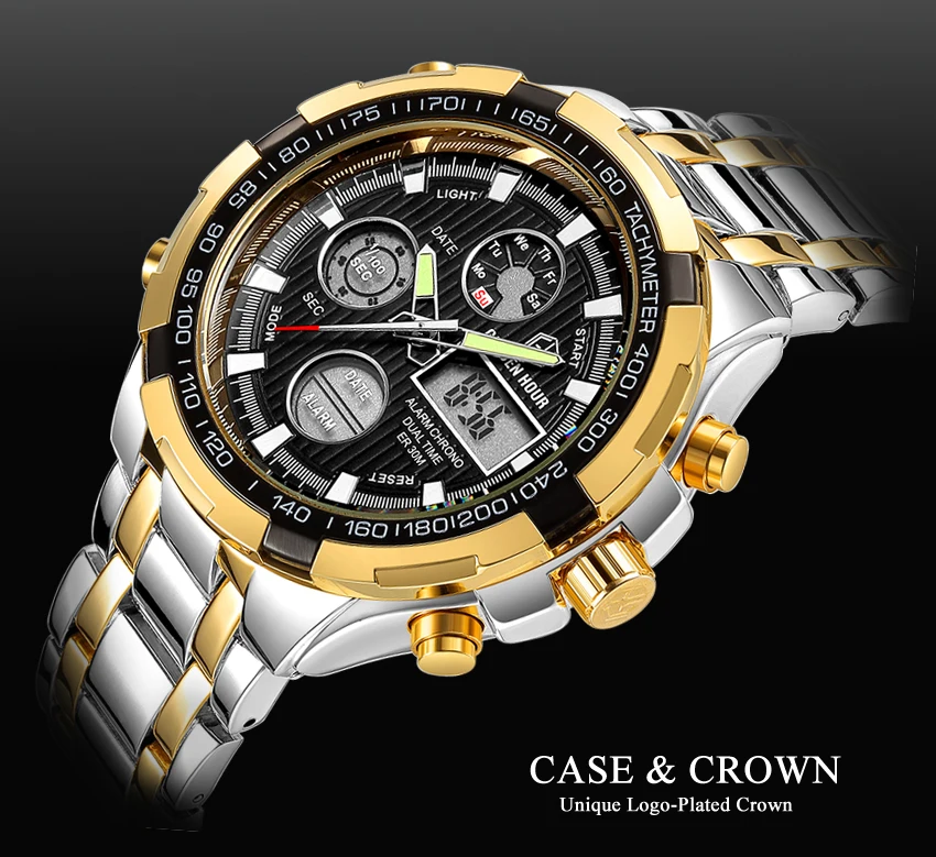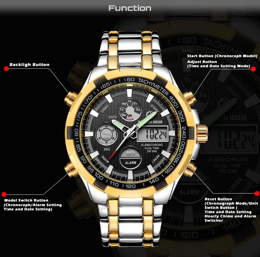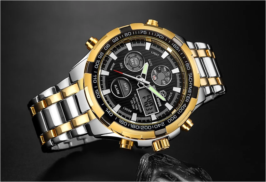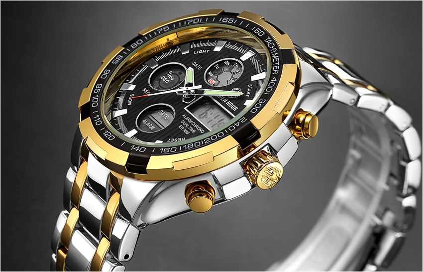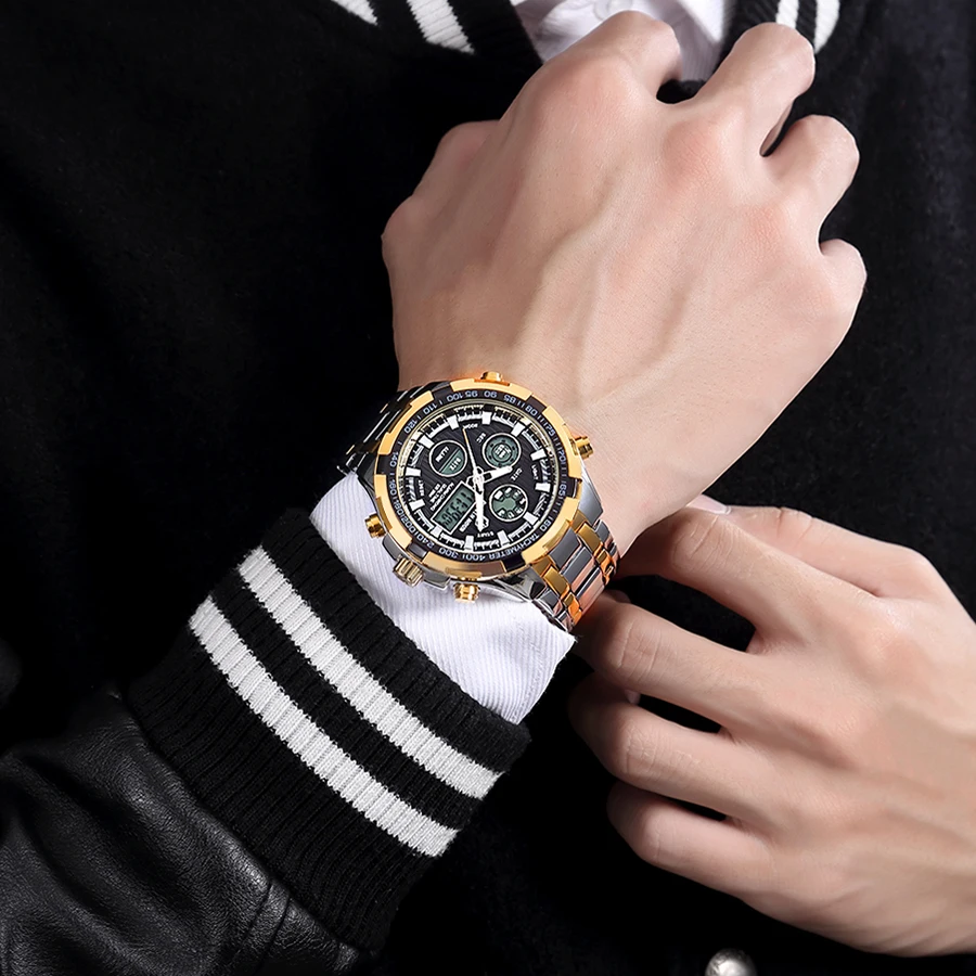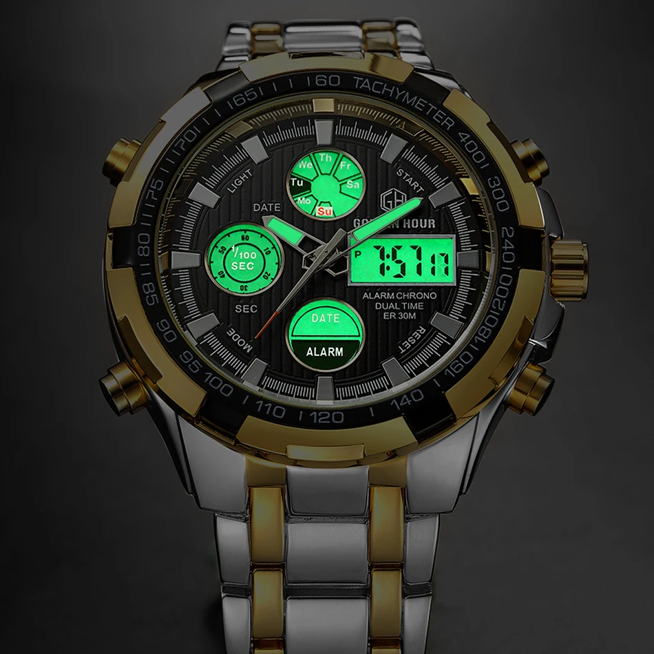 Часы наручные GOLDENHOUR Мужские кварцевые, брендовые аналоговые спортивные полностью стальные водонепроницаемые в стиле милитари