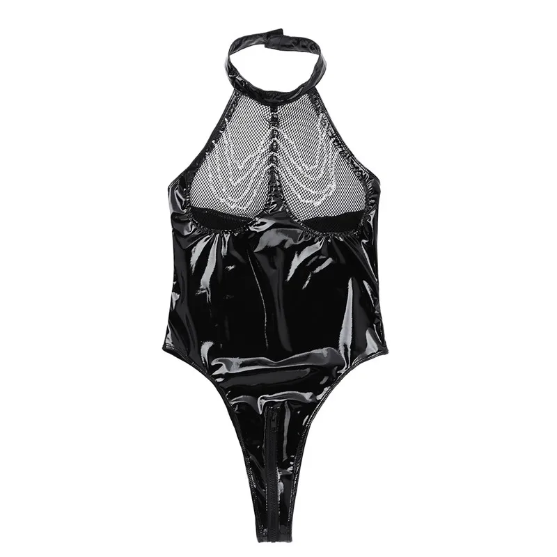 Сексуальное боди из лакированной кожи, Цельный купальник, женское Монокини в сеточку без рукавов, с лямкой через шею, на молнии, с открытой промежностью