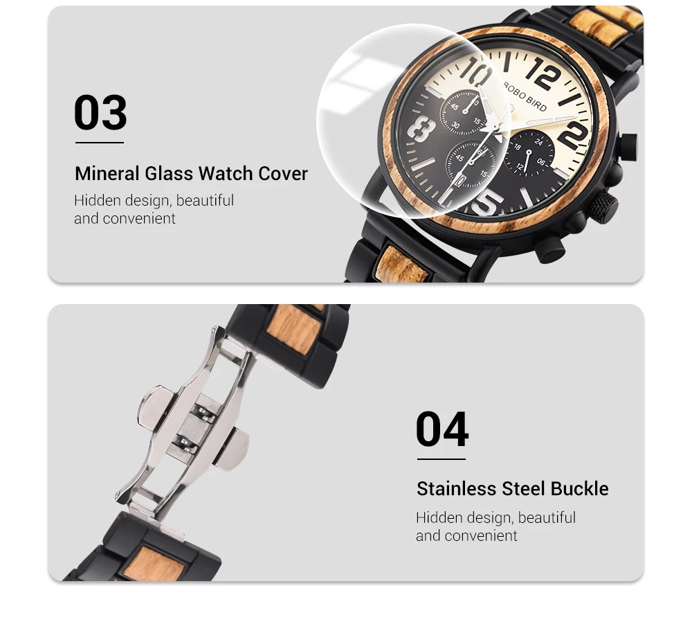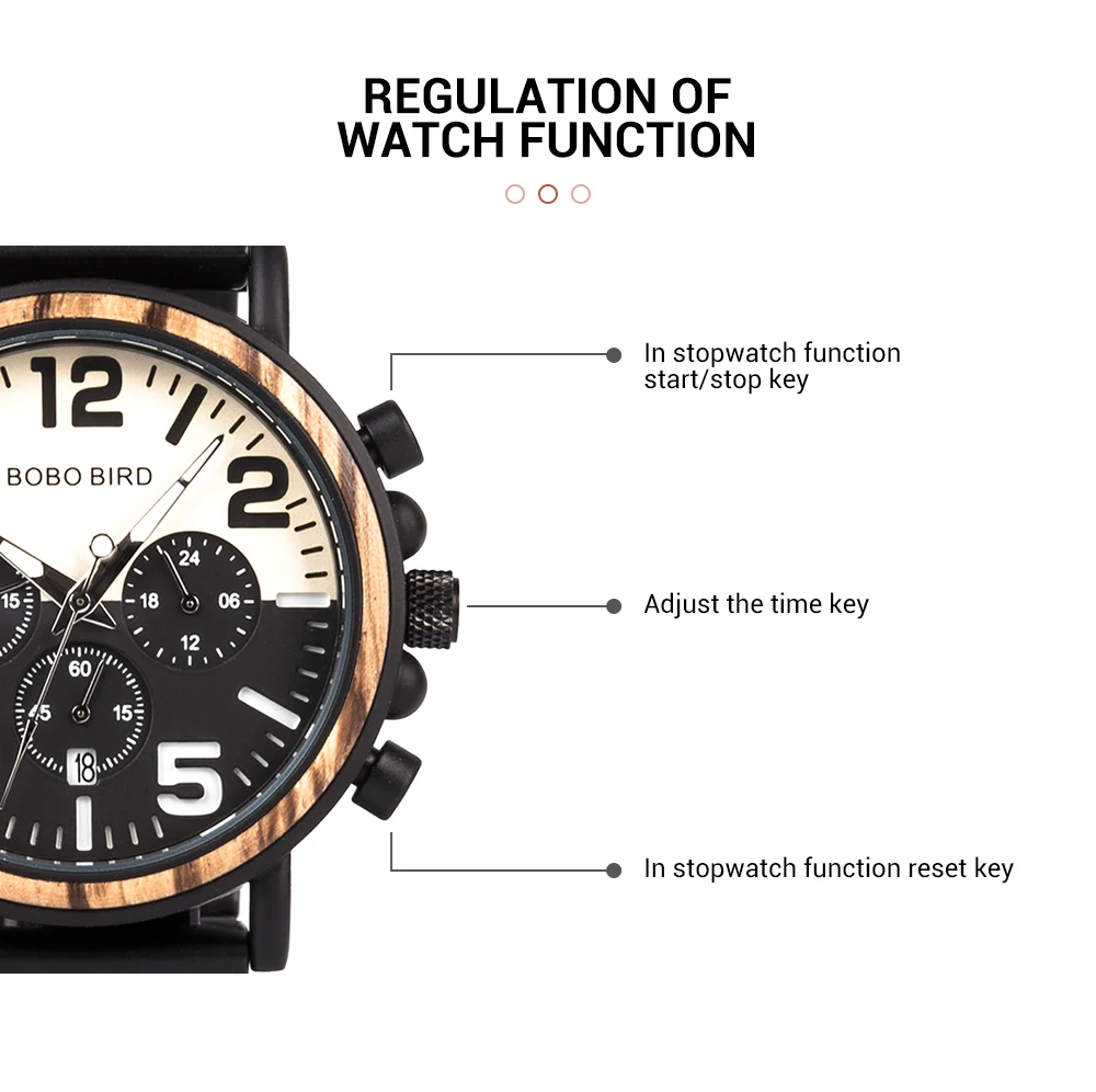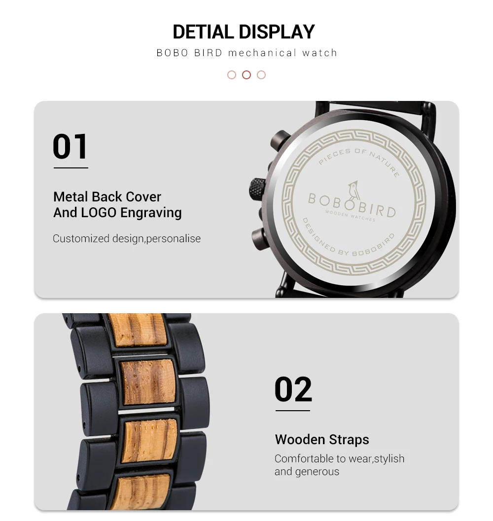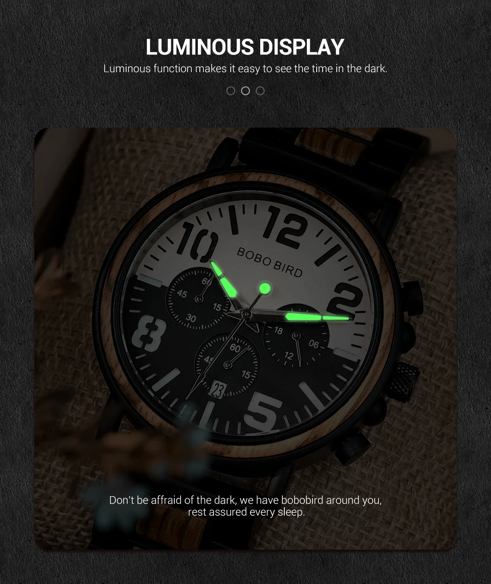 Светящаяся функция позволяет легко видеть время в темноте. Не бойтесь темноты, у нас есть bobobird вокруг вас, будьте уверены каждый день