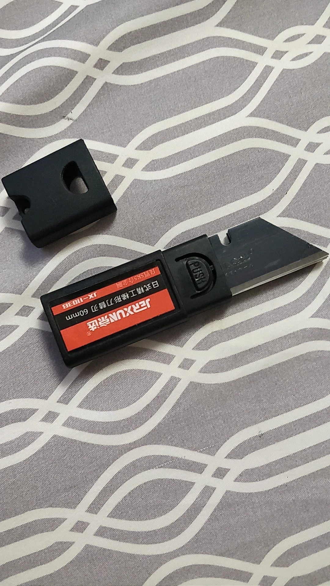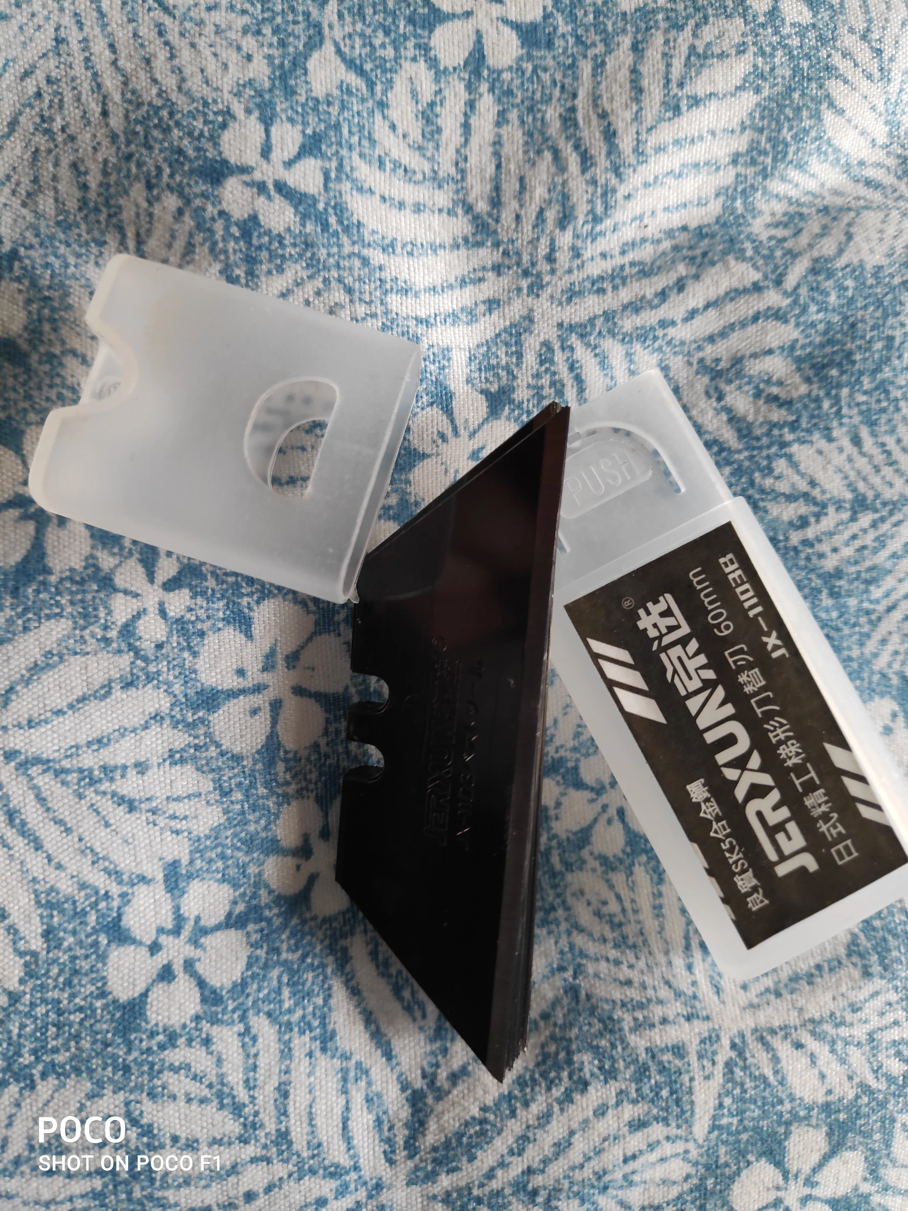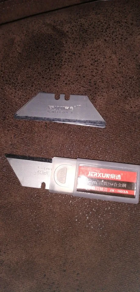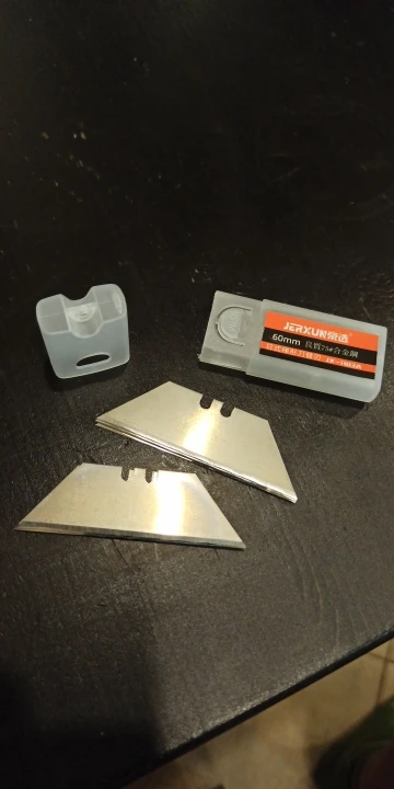 Лезвия, на мой взгляд, как и заявлено, очень хорошие. Пока любовался, чуть не обрезался. Идут в жёстком пластиковом чехлес кнопкой-фиксатором и петелькой для подвеса (наверное для любителей что-нибудь постоянно резать, для моментальной смены магазина :)). Вообще, впечатляют. Сразу поставил на свой резак.