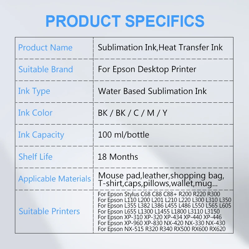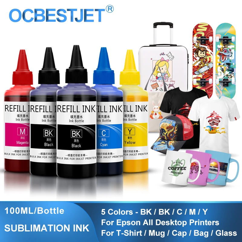 100 мл, 5 цветовкомплект, сублимационные чернила для Epson ET-2720 ET-2760 ET-2750 ET-15000 ET-4700 ET-3760 WF-7710, принтер для всех моделей
