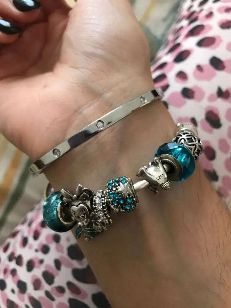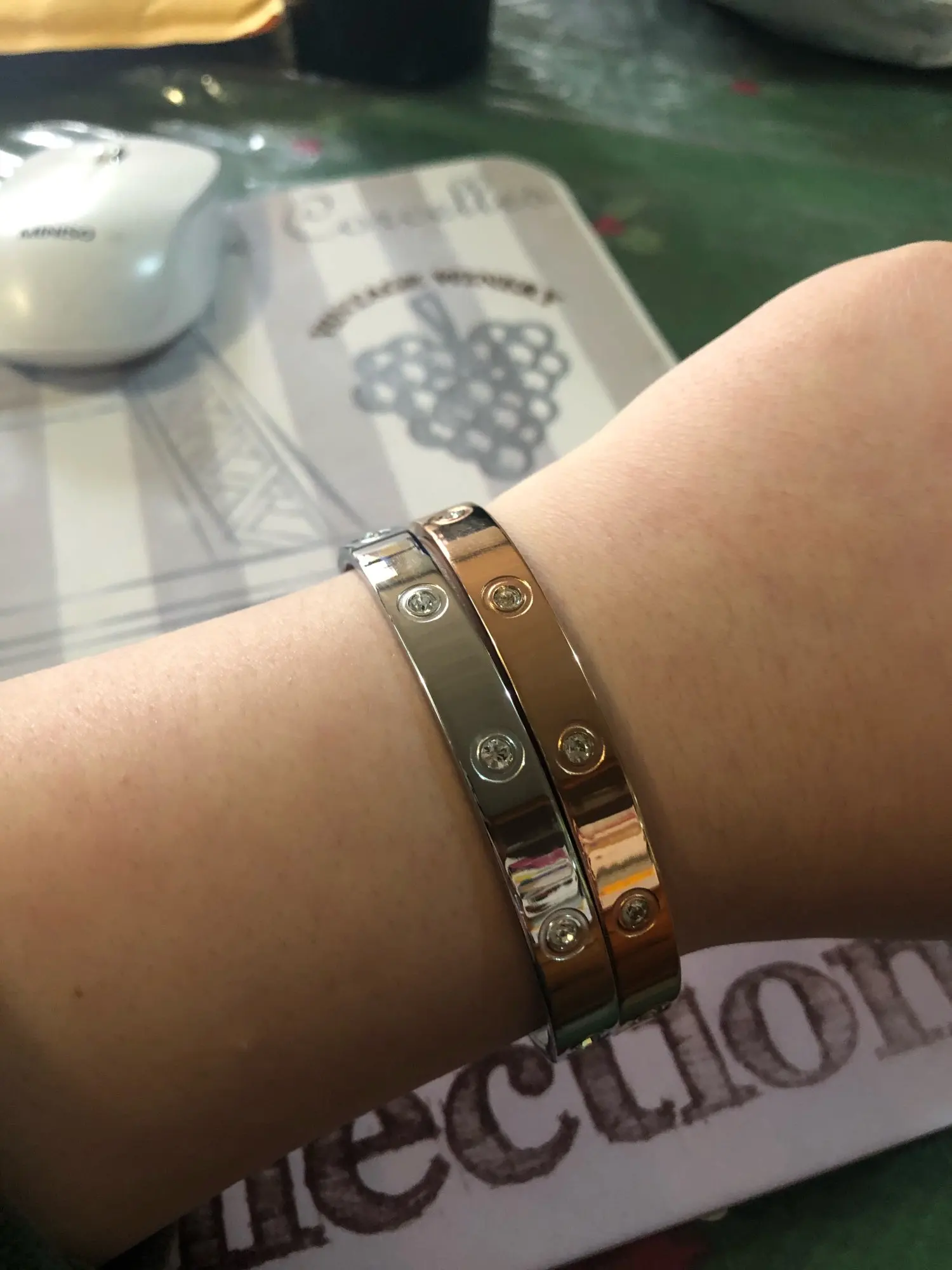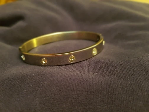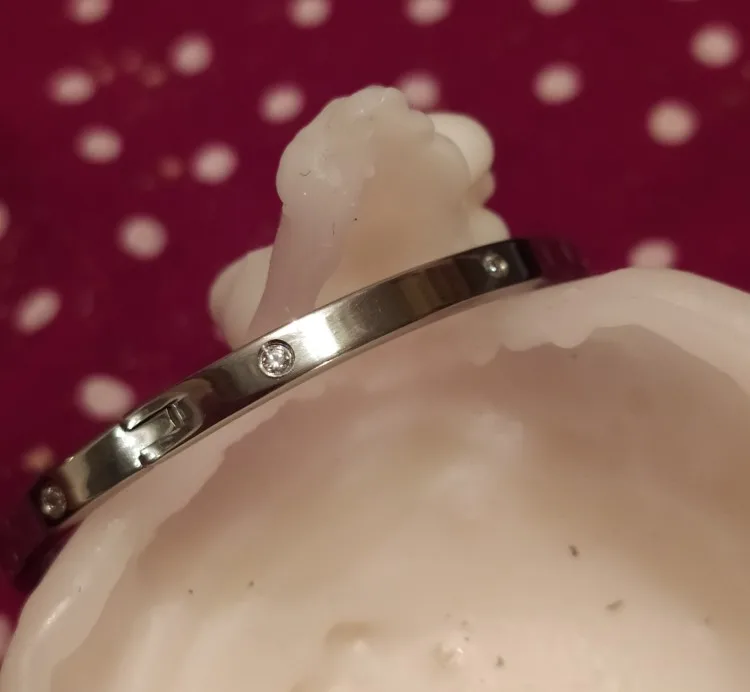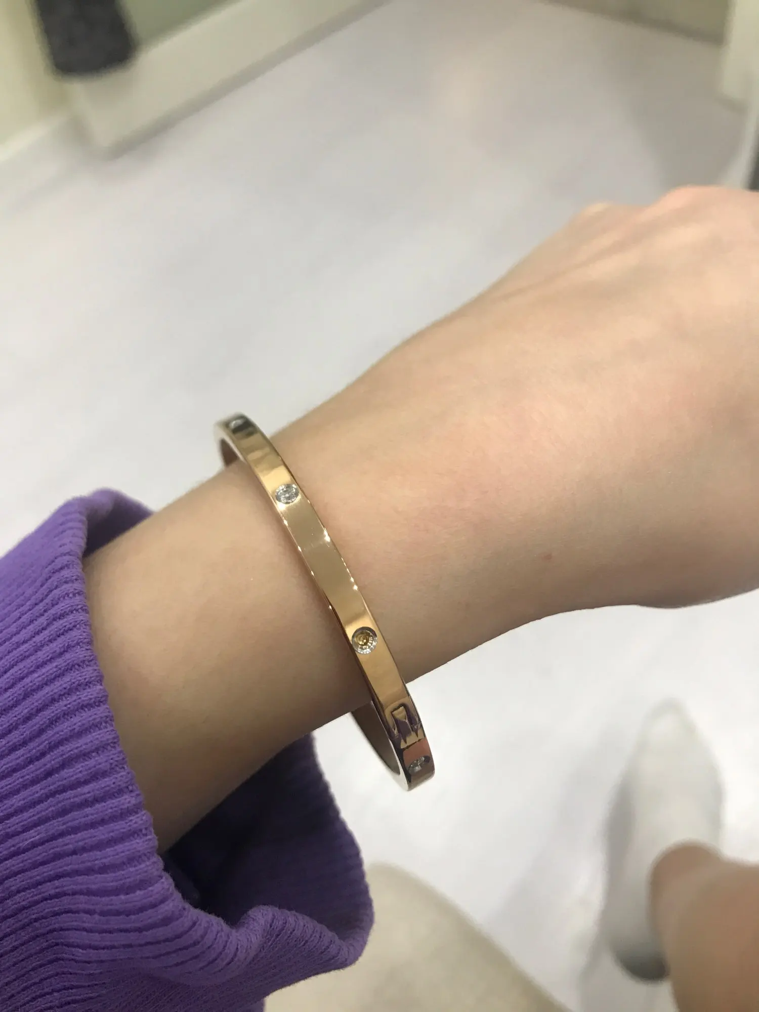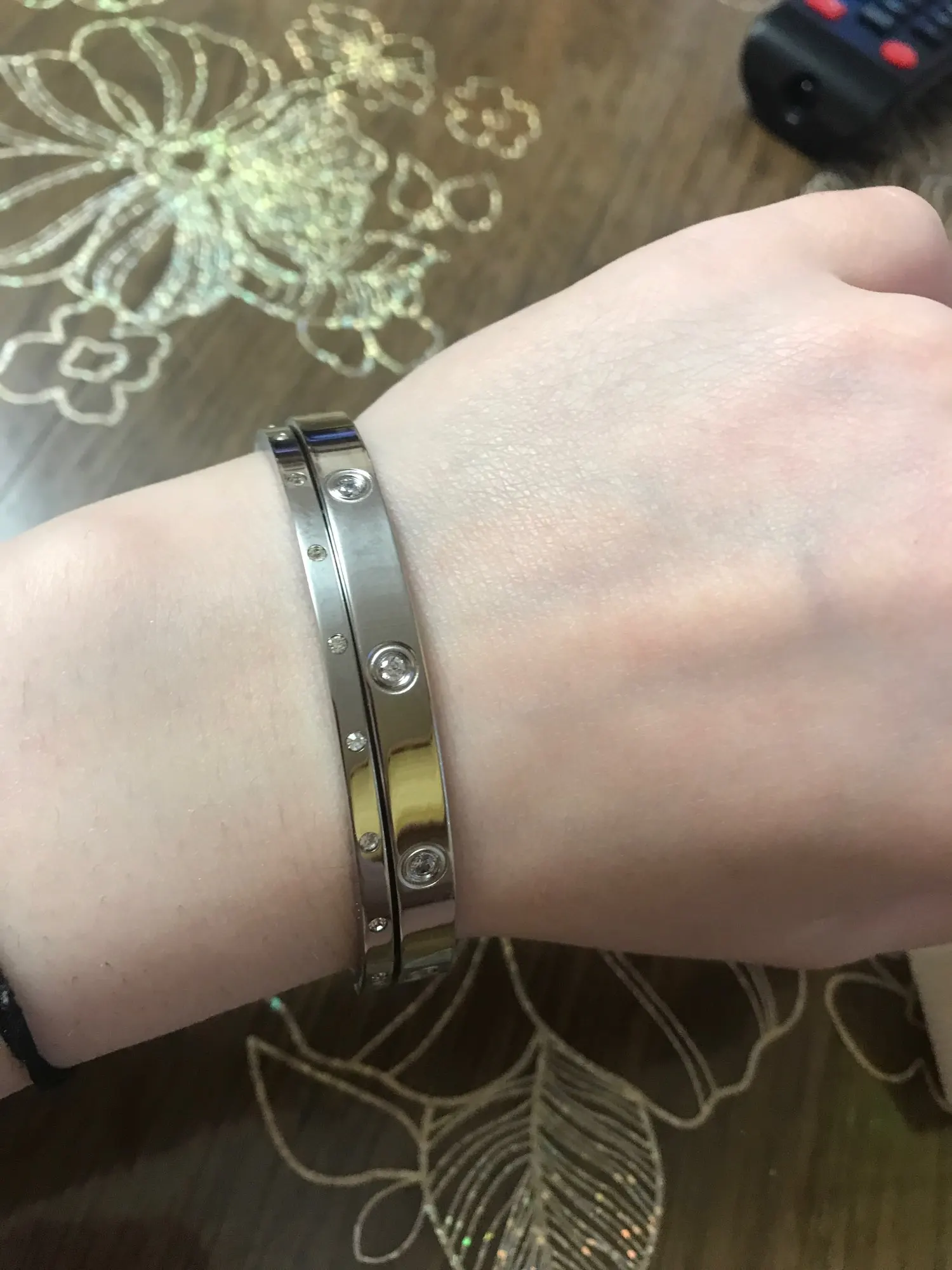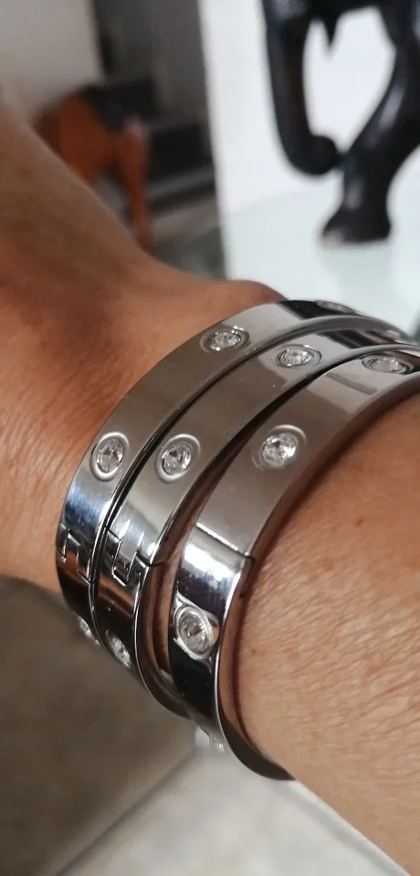 Шикарный браслет в стиле известного бренда.Доставка товара в пределах трех недель,с треком отслеживания до нашего почтового отделения. У продавца по ссылке браслеты трёх цветов : золотой,цвета серебра и цвета розового золота.Я выбрала серебро.Металл - нержавеющая сталь.Растегивается и застёгивается при помощи простейшего механизма.Все камешки на месте.На ручке сидит шикарно,стильное и оригинальное украшение. Браслетик супер !Ношу с удовольствием!