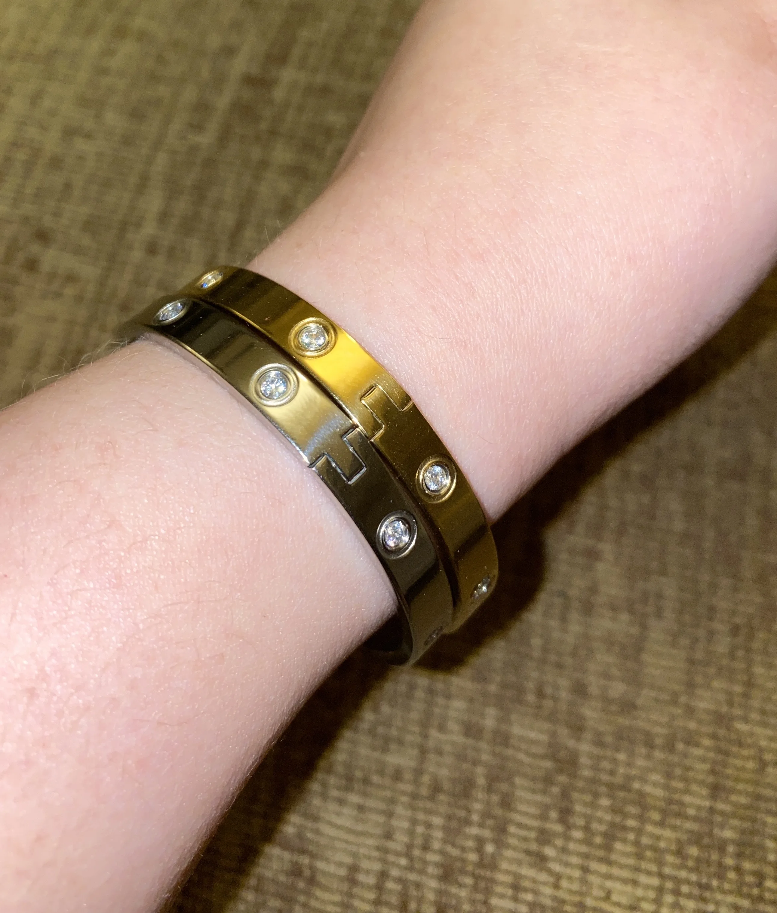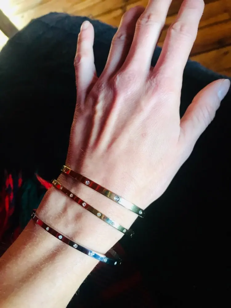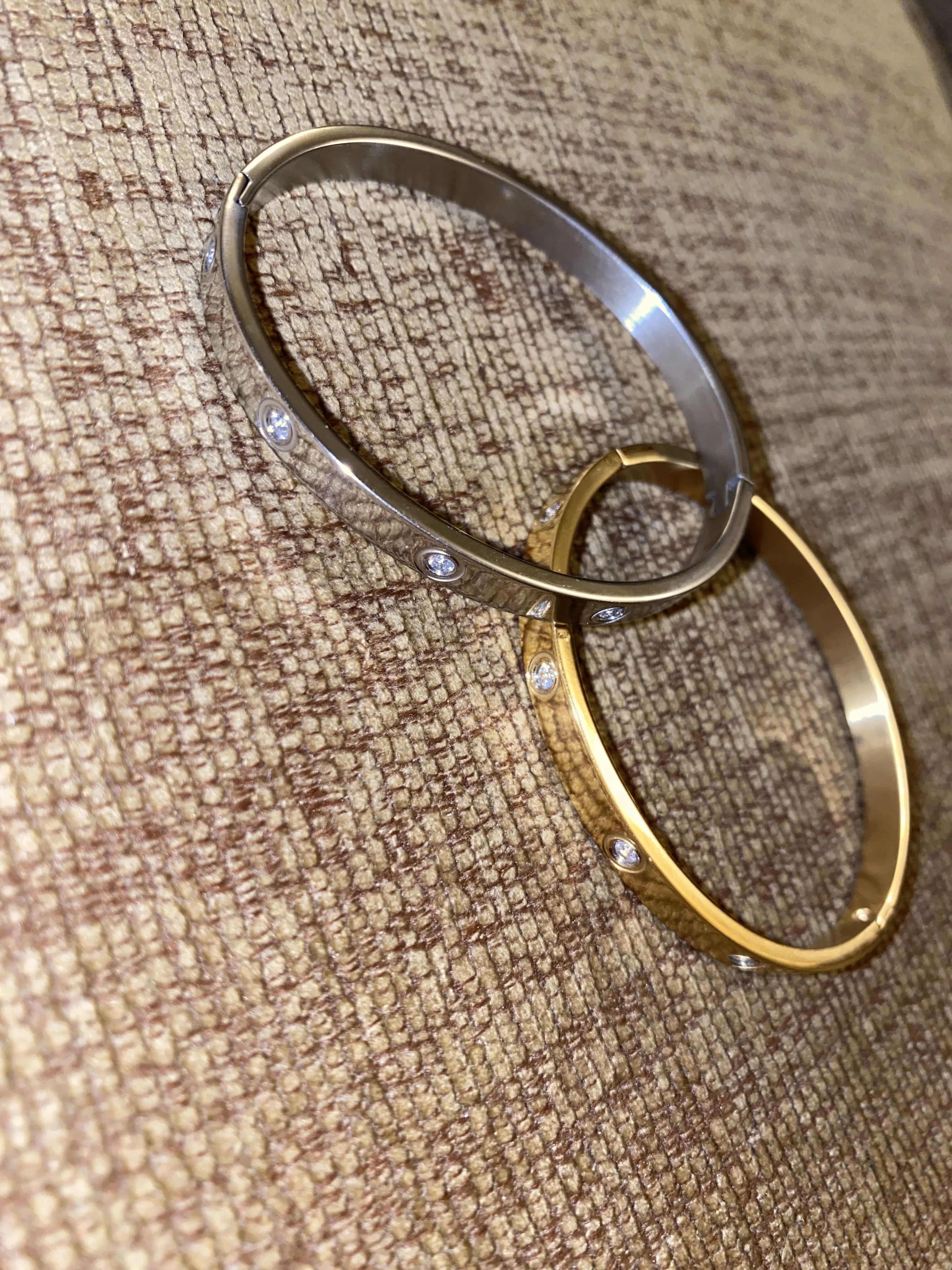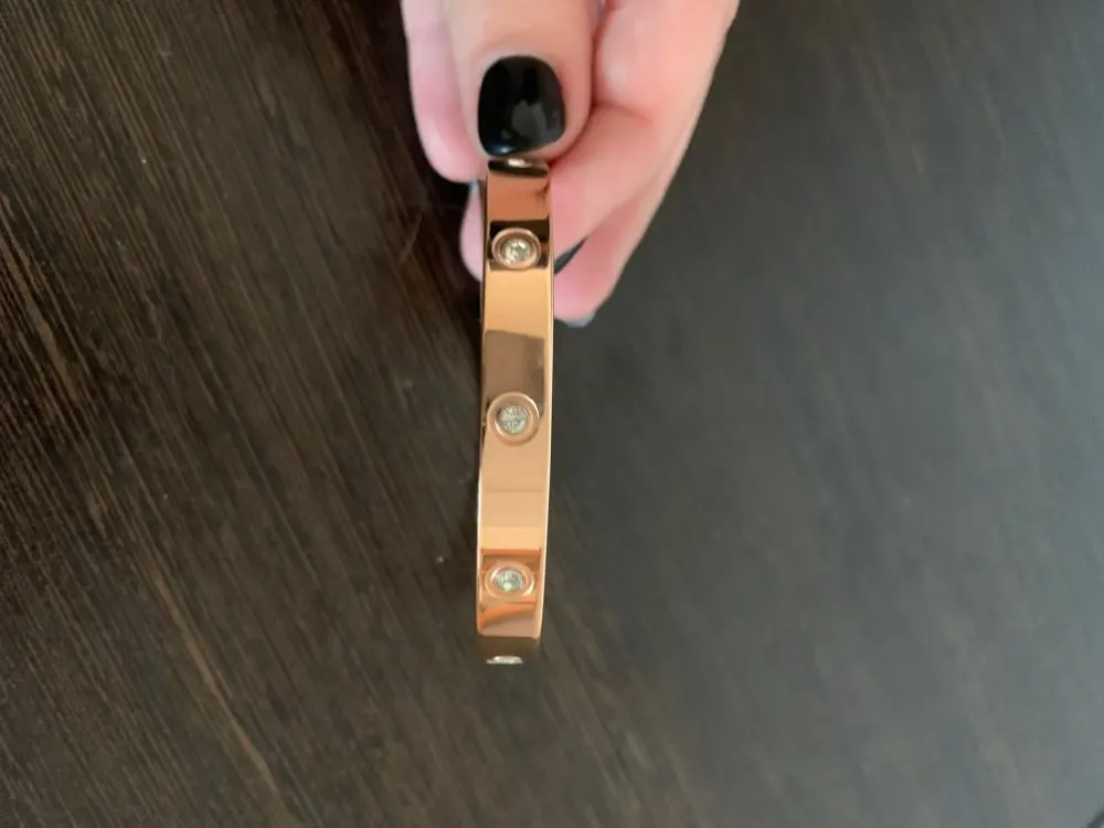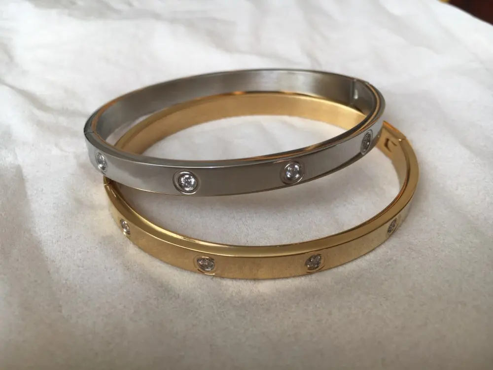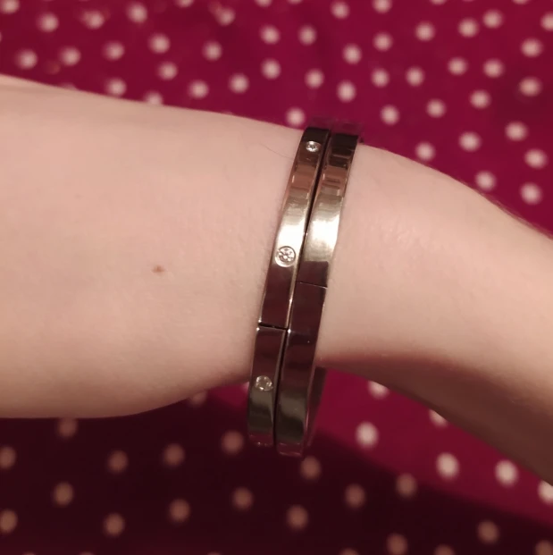Шикарный браслет в стиле известного бренда.Доставка товара в пределах трех недель,с треком отслеживания до нашего почтового отделения. У продавца по ссылке браслеты трёх цветов : золотой,цвета серебра и цвета розового золота.Я выбрала серебро.Металл - нержавеющая сталь.Растегивается и застёгивается при помощи простейшего механизма.Все камешки на месте.На ручке сидит шикарно,стильное и оригинальное украшение. Браслетик супер !Ношу с удовольствием!